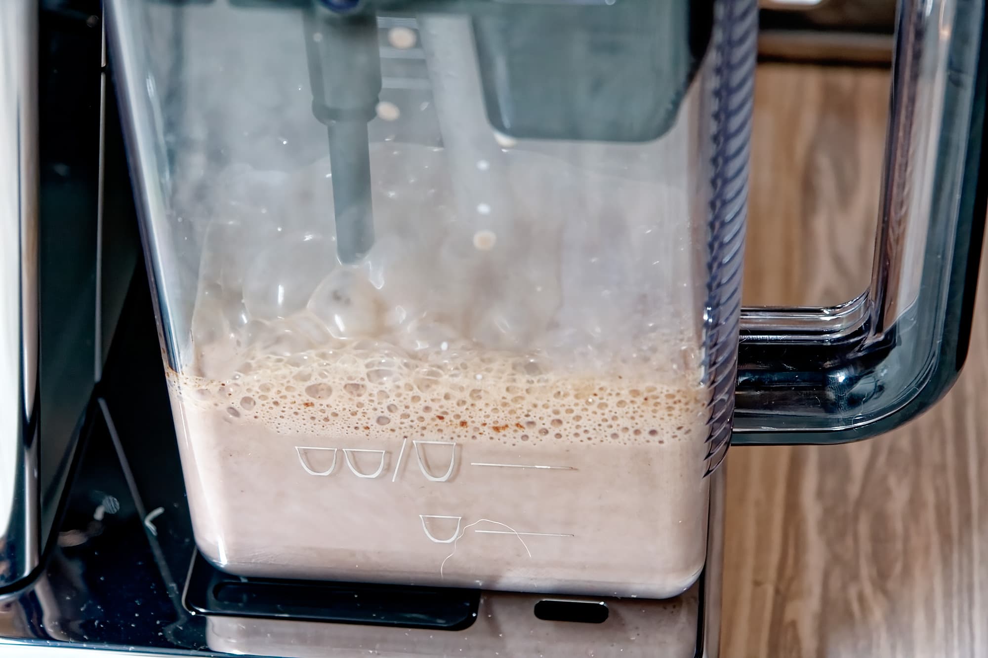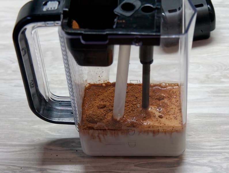 Согласно инструкции, мы залили в кувшин молоко до соответствующей отметки, добавили несколько ложек какао и запустили процесс приготовления.