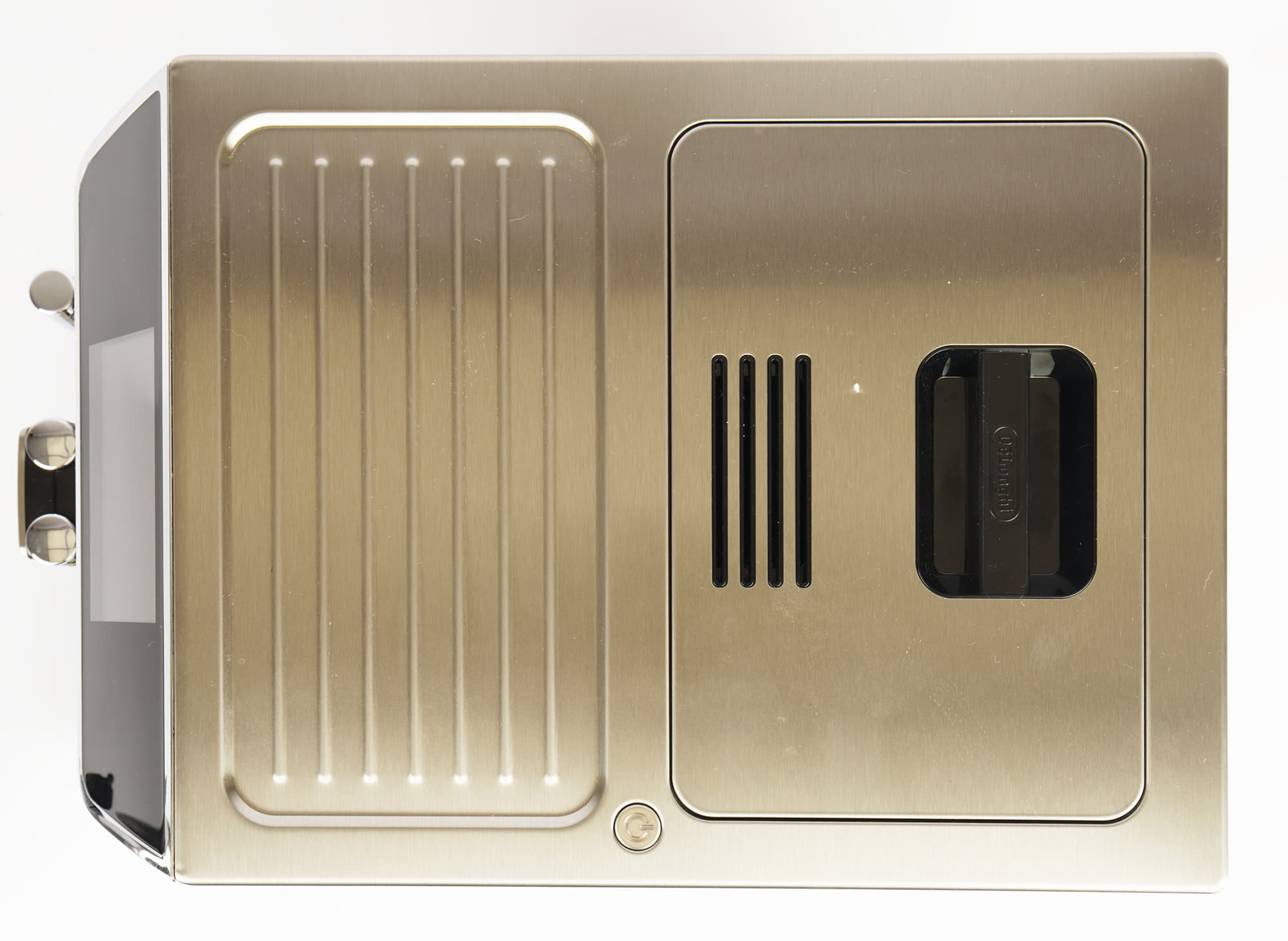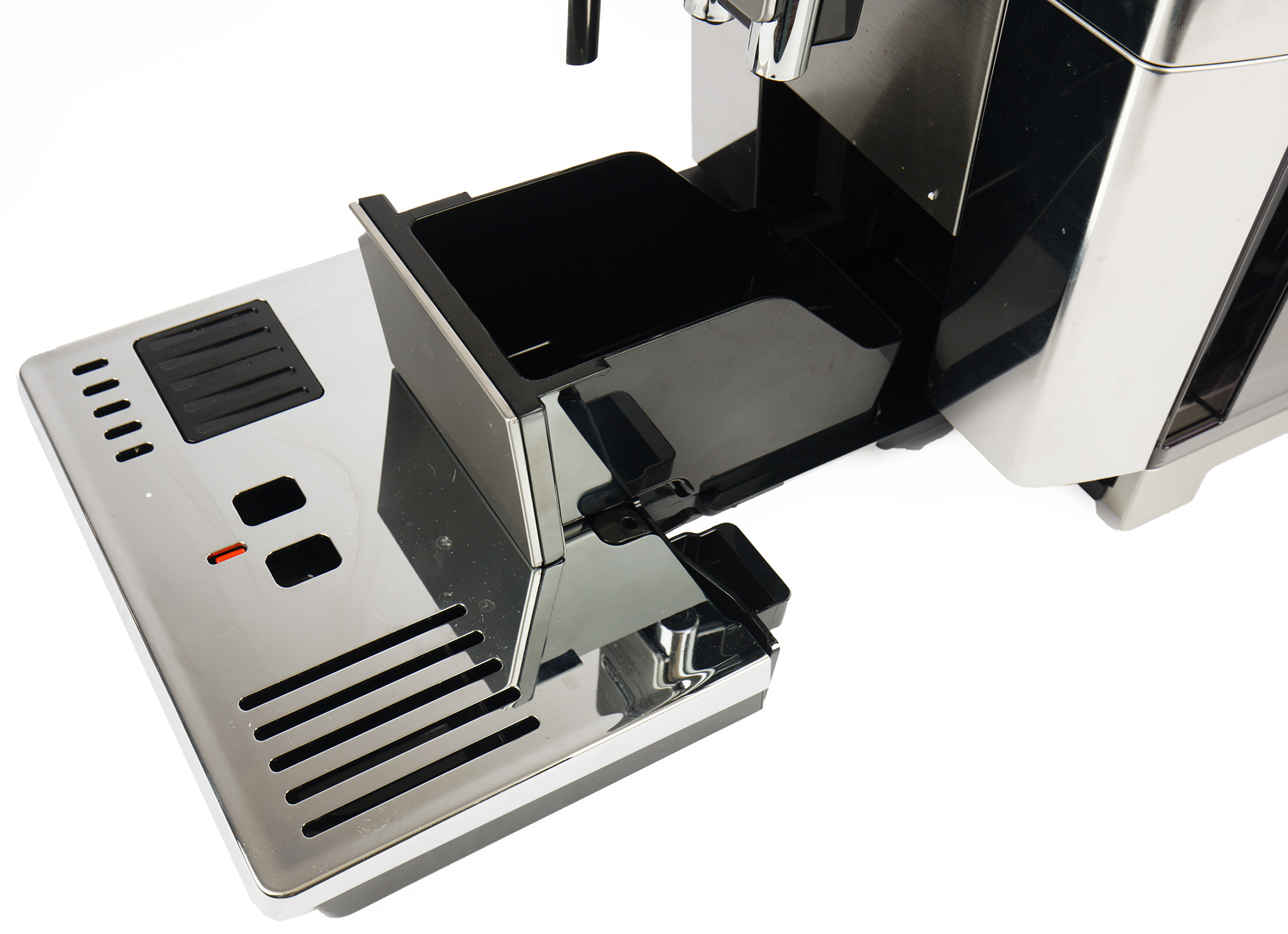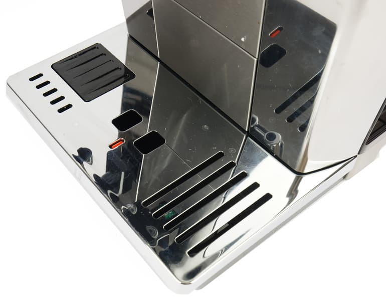 Передняя панель, верхняя панель (место для подогрева чашек), крышка отсека для кофе — также металлические. Кстати, подогрев для чашек в данной модели активный — его можно включать либо отключать по желанию.