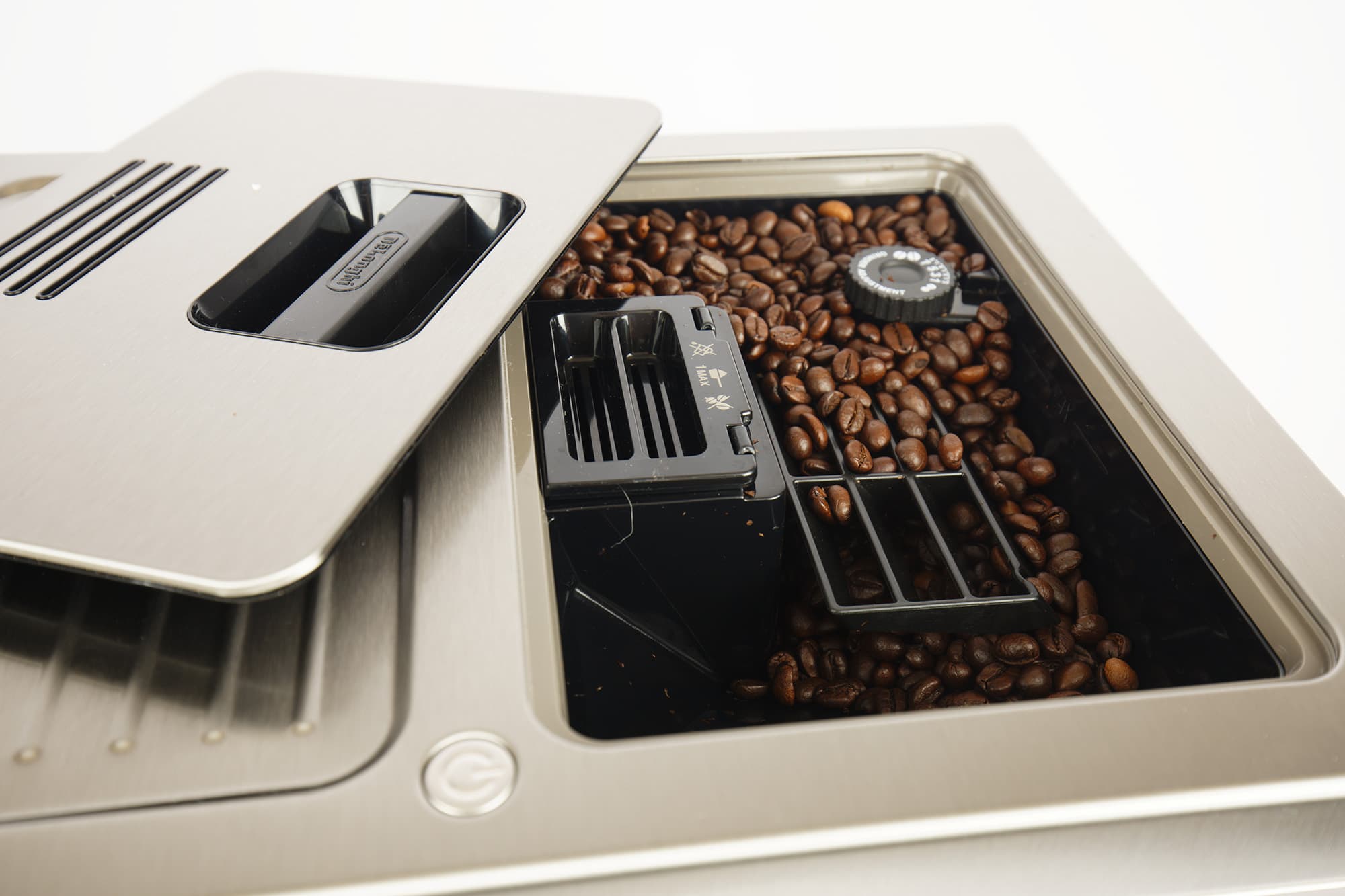 Сверху также расположен поддон для чашек и объемный отсек для зернового кофе, закрывающийся металлической крышкой с плотным уплотнителем. Такое решение не только гасит шум от кофемолки, но также позволяет дольше сохранить свежесть зерен.