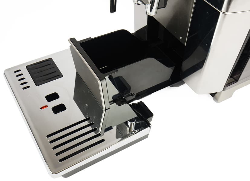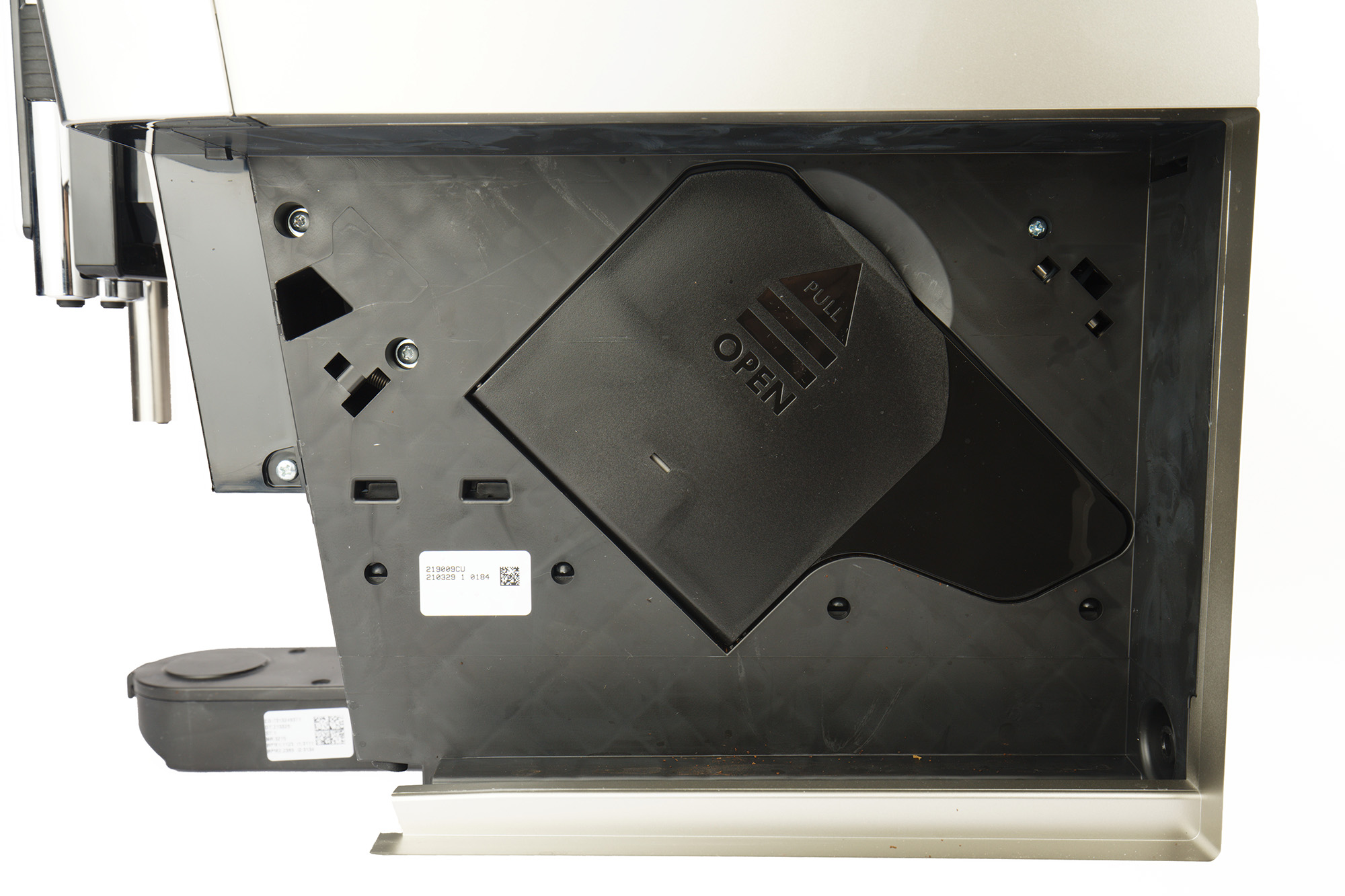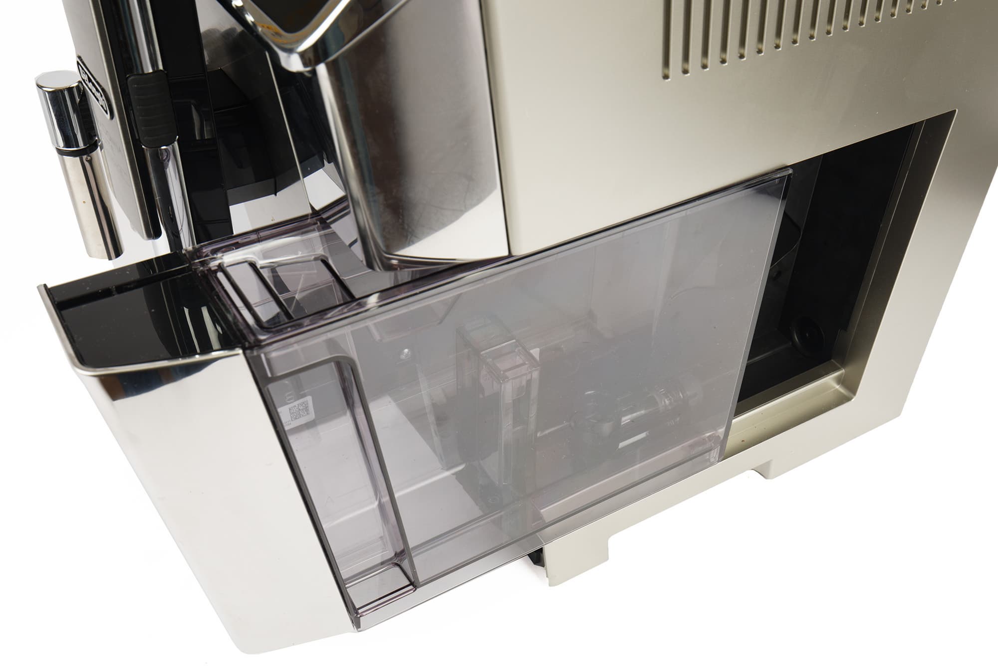 Контейнер для отходов вмещает около 14 порций, то есть нам придется опустошать его в среднем после приготовления 14 напитков. Достается контейнер спереди, вместе с отсеком для сбора капель. Насколько часто придется выливать воду — зависит от того, какие напитки вы предпочитаете готовить чаще (капучинатор нельзя надолго оставлять без запуска очистки, иначе молоко засохнет, а это — дополнительный расход воды).