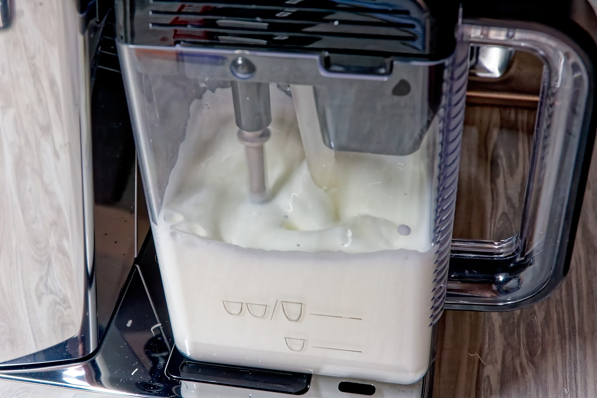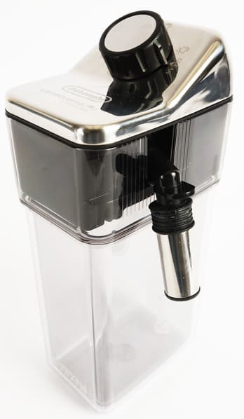 Молоко наливается в прозрачный контейнер, а оттуда оно автоматически подается через съемную резиновую трубку в крышку кувшина (которая, собственно, и является капучинатором-вспенивателем). Носик подачи молока можно подвинуть вверх/вниз, а трубку-насадку — выдвинуть либо задвинуть, регулируя тем самым ее длину.