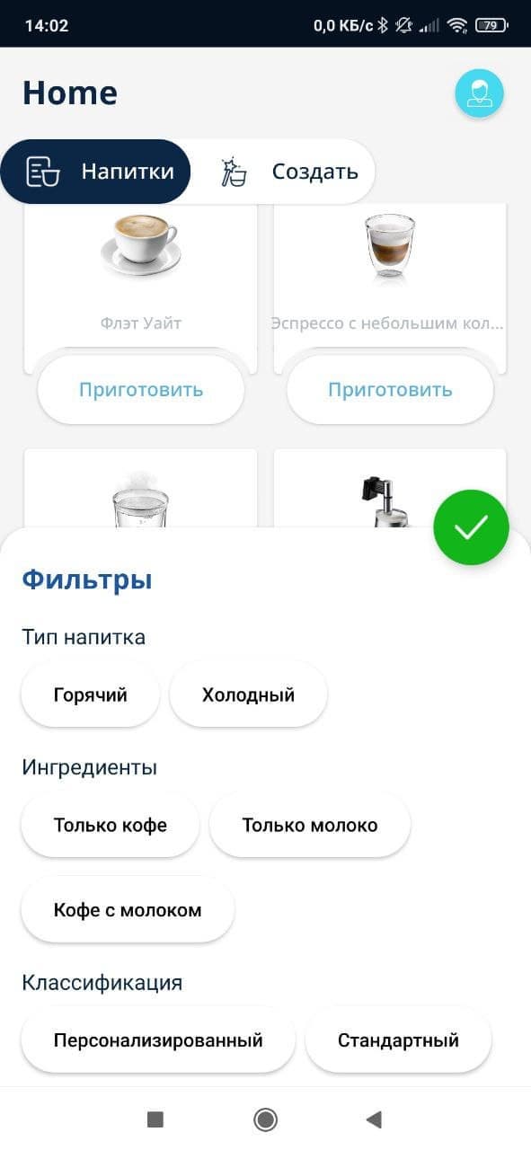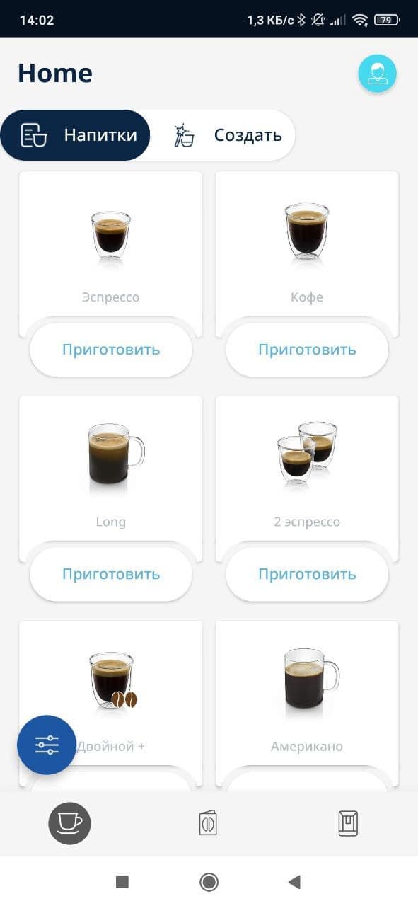 Находясь на главном экране, который появляется автоматически после того, как прибор будет готов к работе, пользователь может одним нажатием запустить приготовление выбранного рецепта (напитка) либо несколькими нажатиями запустить нужный рецепт с внесением некоторых изменений.