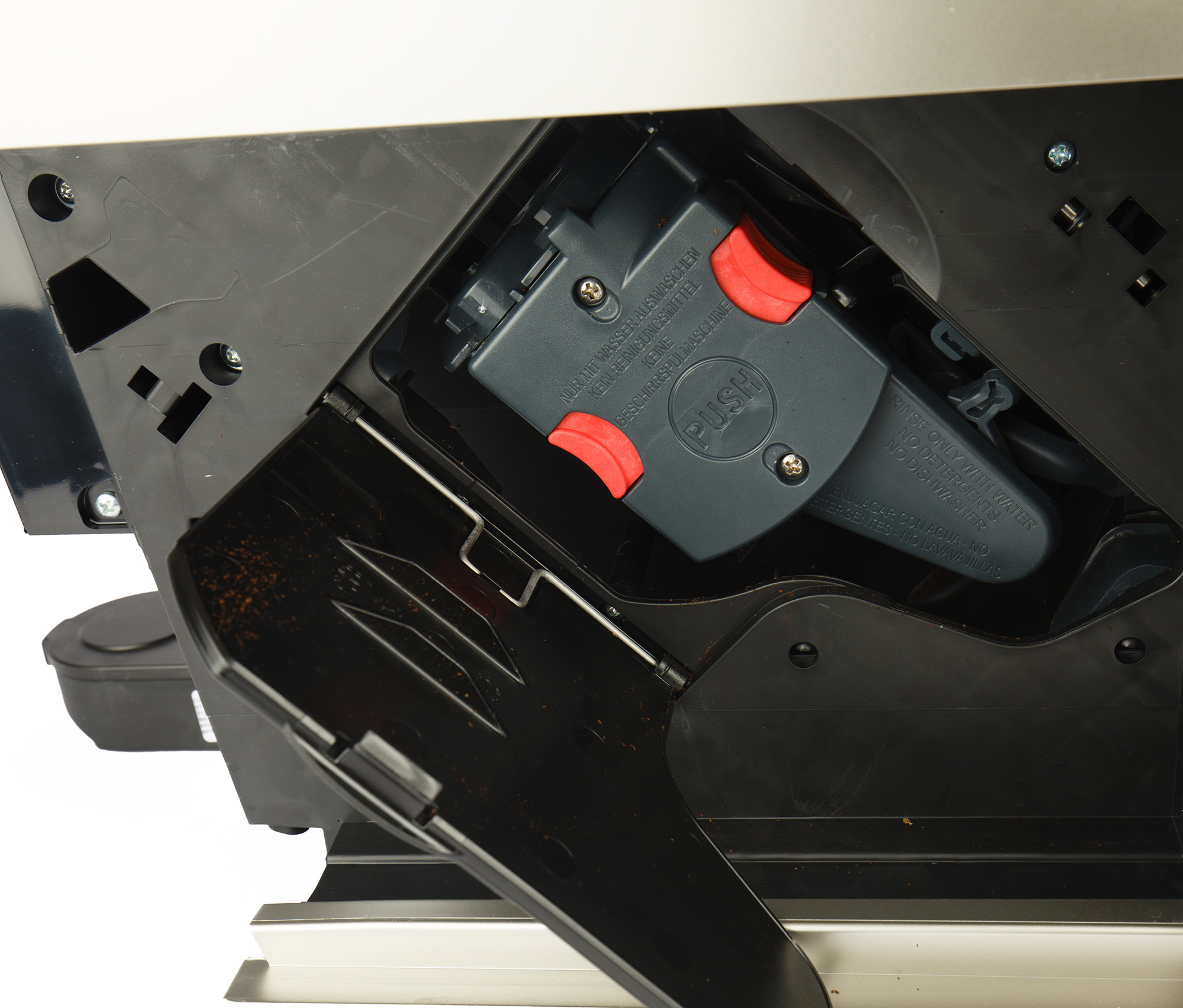 За контейнером для воды скрывается пластиковый люк, а за люком — компактный заварочный блок, который требует периодического извлечения и очистки.