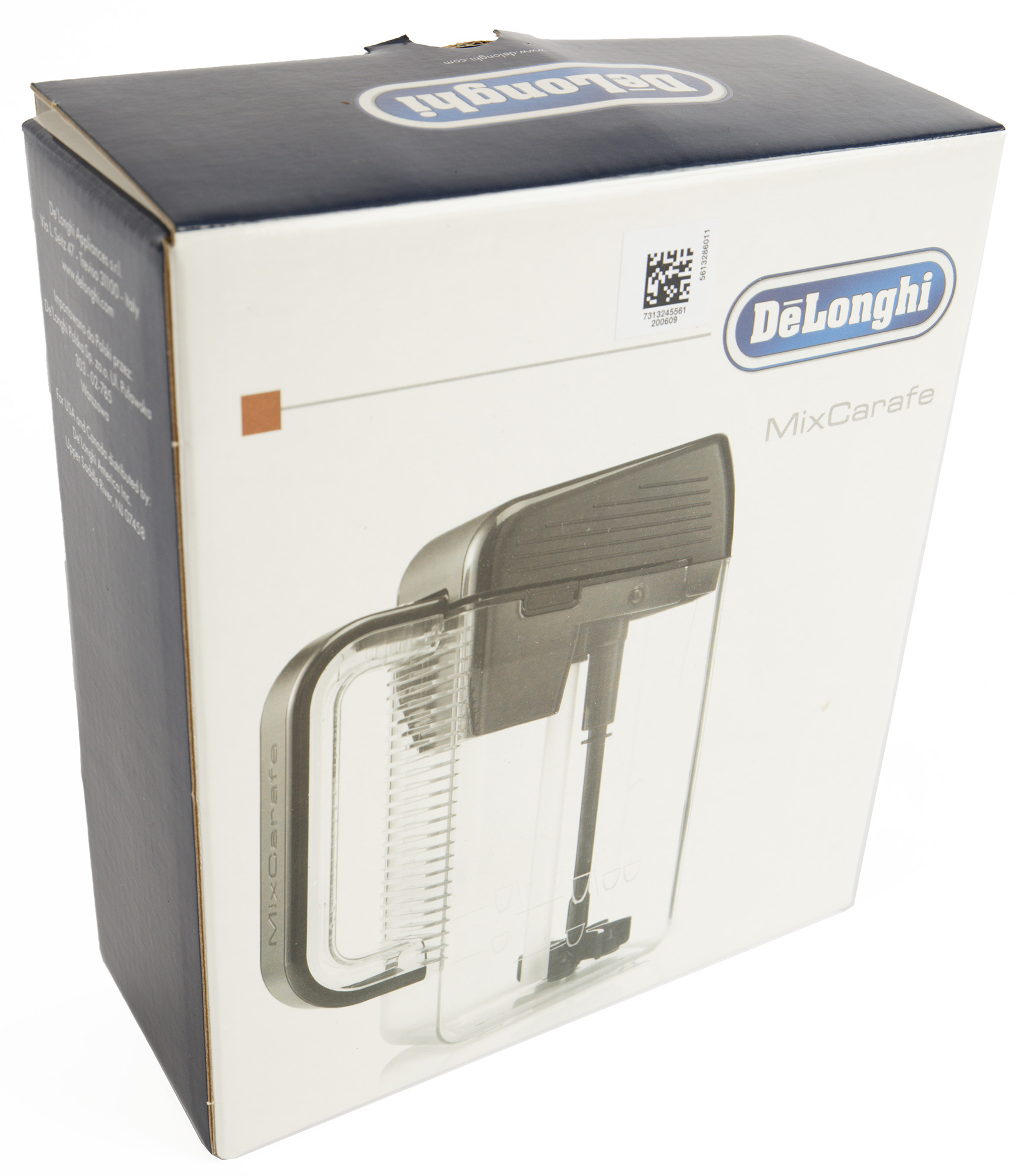 Объемная картонная коробка оказалась оформлена в фирменном стиле De’Longhi: основной цвет — черный, дополнительный — темно-синий, печать полноцветная, фотографии высокого качества.