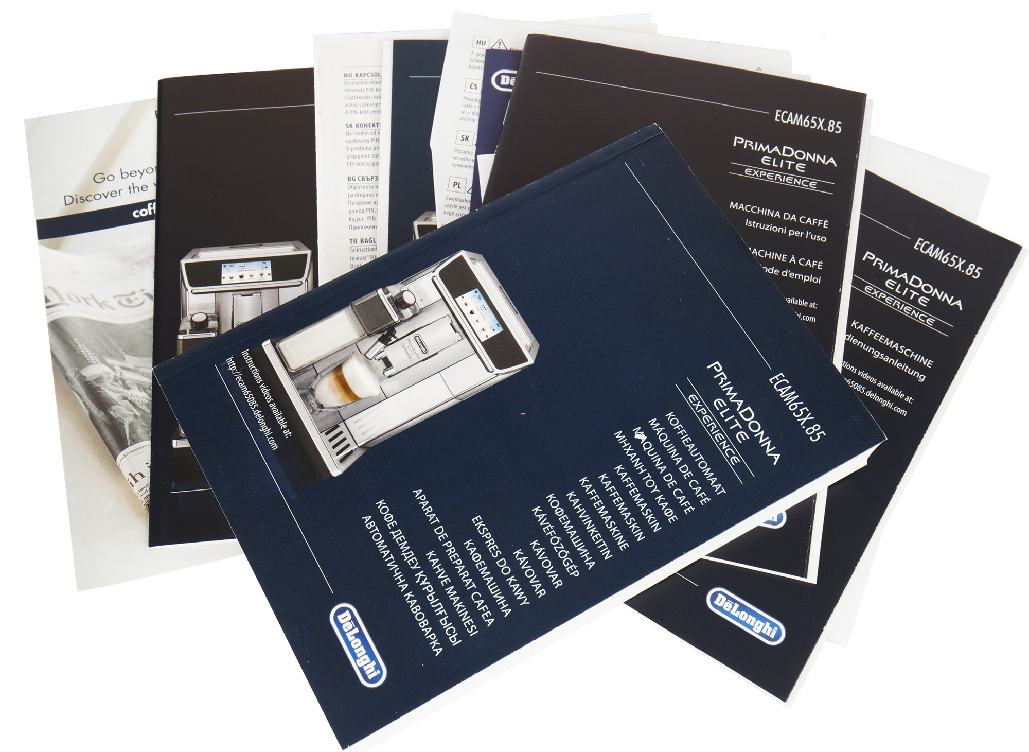 В коробке с кофемашиной обнаружилось множество всевозможных печатных материалов на разных языках, касающихся правил пользования прибором и гарантийных обязательств.