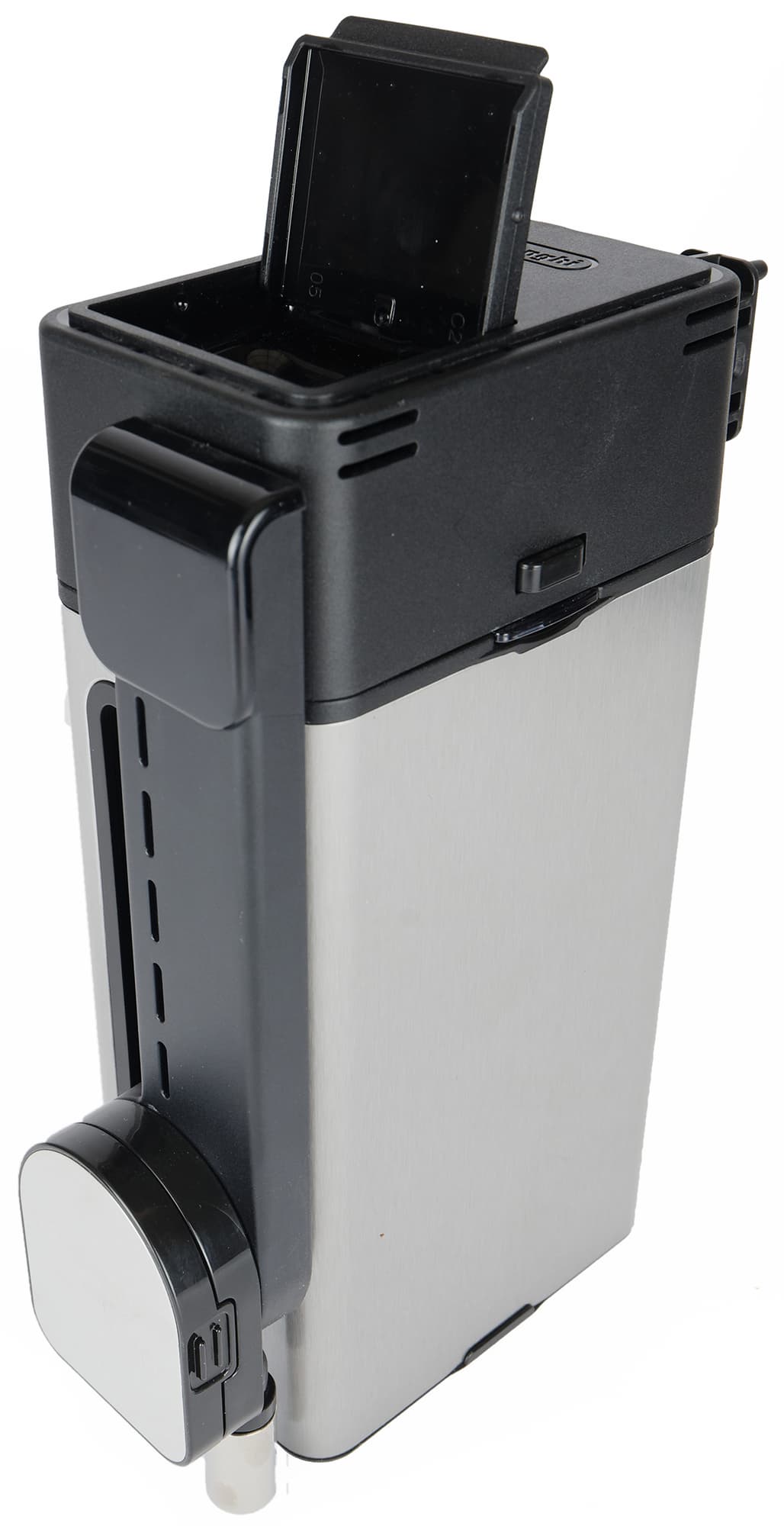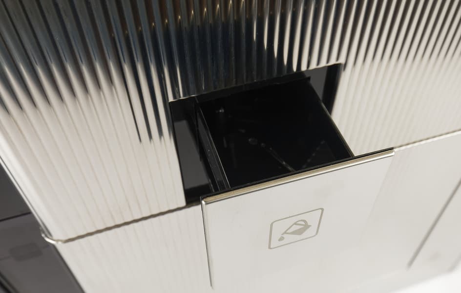 Контейнер для отходов вмещает около 14 порций (то есть, нам придется опустошать его в среднем после приготовления 14 напитков). Достается контейнер спереди, вместе с отсеком для сбора капель. Насколько часто придется выливать воду — зависит от того, какие напитки вы предпочитаете готовить чаще (капучинатор нельзя надолго оставлять без запуска очистки, иначе молоко засохнет, а следовательно каждая очистка капучинатора — это дополнительный расход воды).