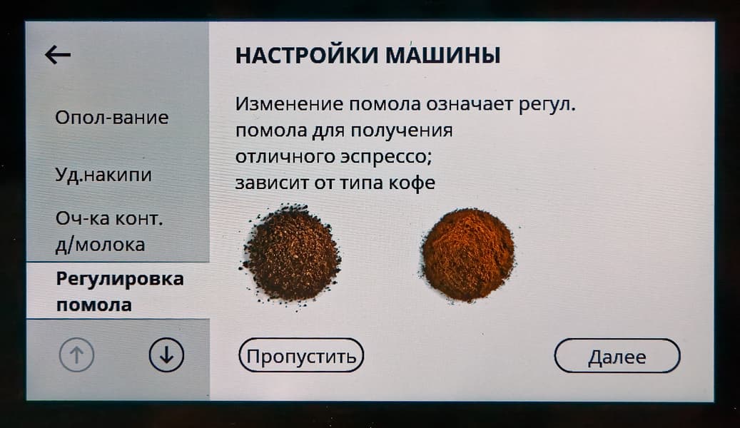 Что с настройкой помола? Нам доступно семь степеней. Регулировка осуществляется программно. За один раз разрешается сменить помол на одну единицу в бо́льшую или меньшую сторону. При этом переключение произойдет постепенно: машина сообщает, что для завершения процесса потребуется приготовить не менее пяти чашек кофе.