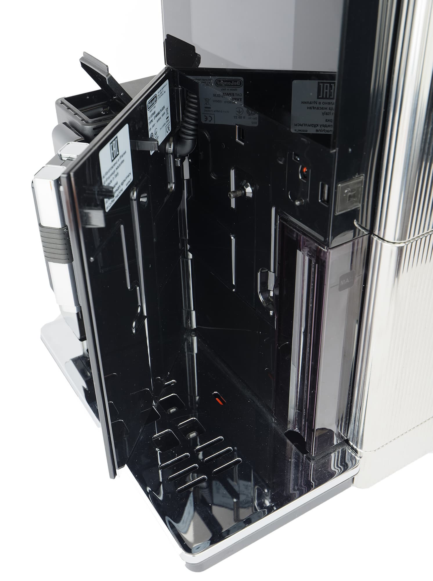 Открыв дверцу, мы получаем доступ к баку для воды, а также можем извлечь контейнер с отработанными кофейными таблетками и поддон для капель, они извлекаются движением «на себя».