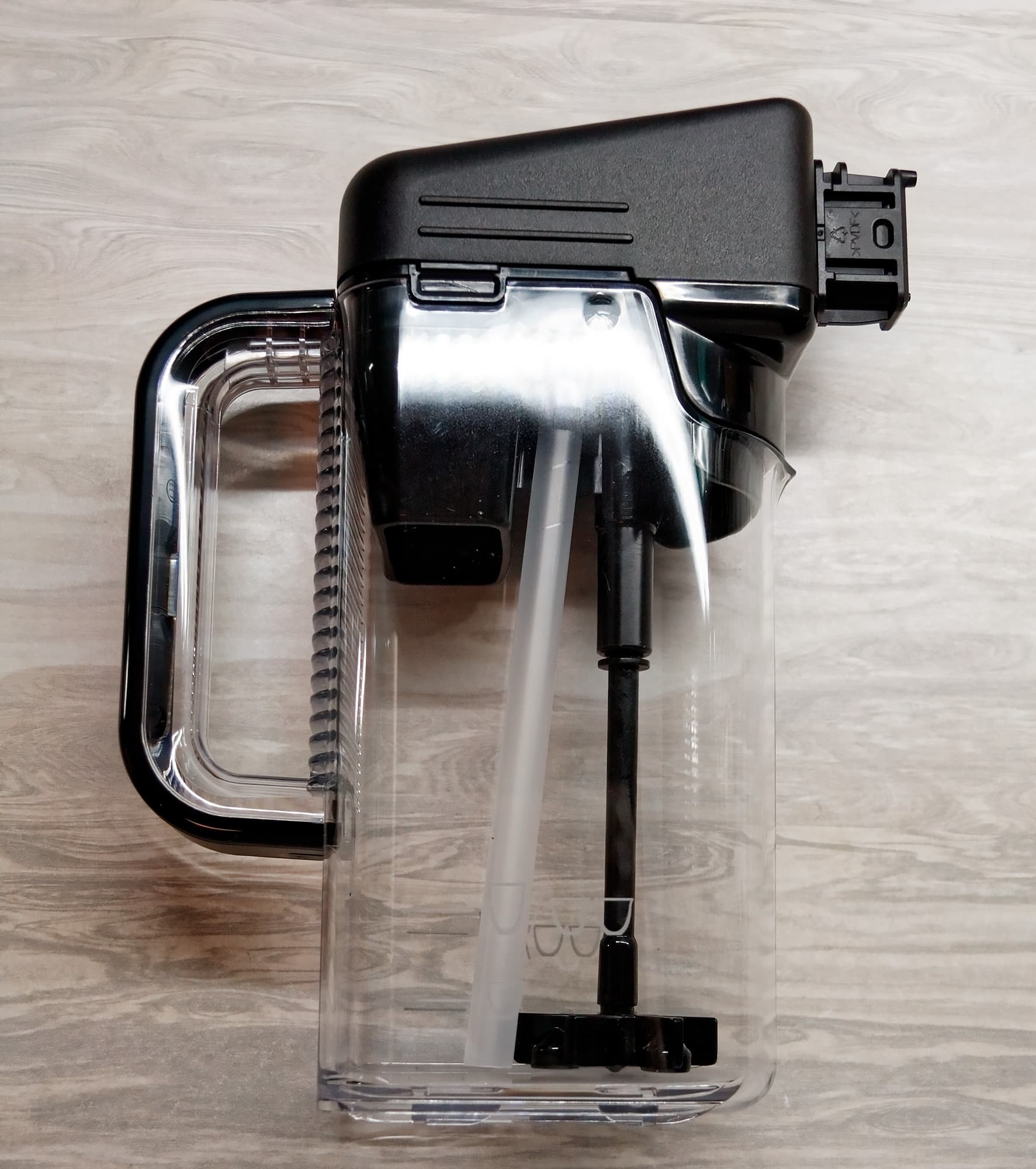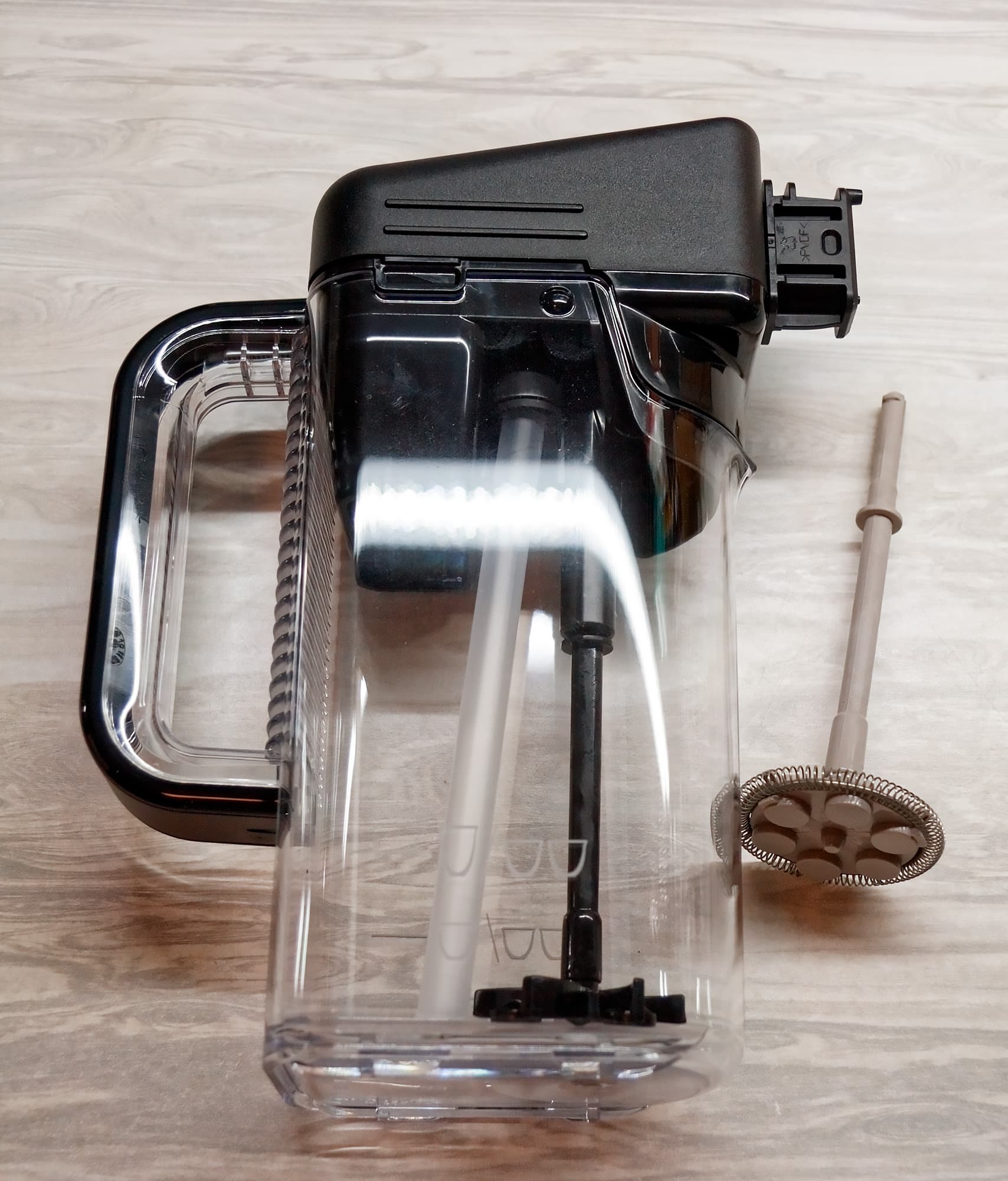 Внутри корпуса прячется контейнер объемом 500 миллилитров с градуировкой и отметкой Max. В этот контейнер наливается молоко, которое автоматически подается через съемную резиновую трубку в крышку (которая, собственно, и является капучинатором), а затем — в подвижный носик подачи молока, который нужно направить прямо в чашку.