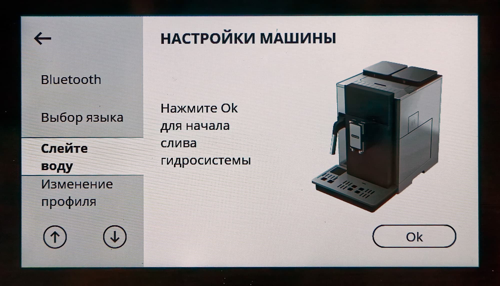Цветной сенсорный TFT-дисплей с диагональю в 5 дюймов у нашей кофемашины симпатичный: все надписи легко читаются даже при ярком освещении, сенсор срабатывает уверенно. Возможность регулировки наклона дисплея позволяет без проблем установить машину как на уровне лица, так и на довольно невысоком столике.