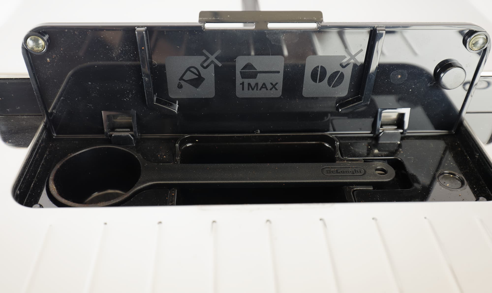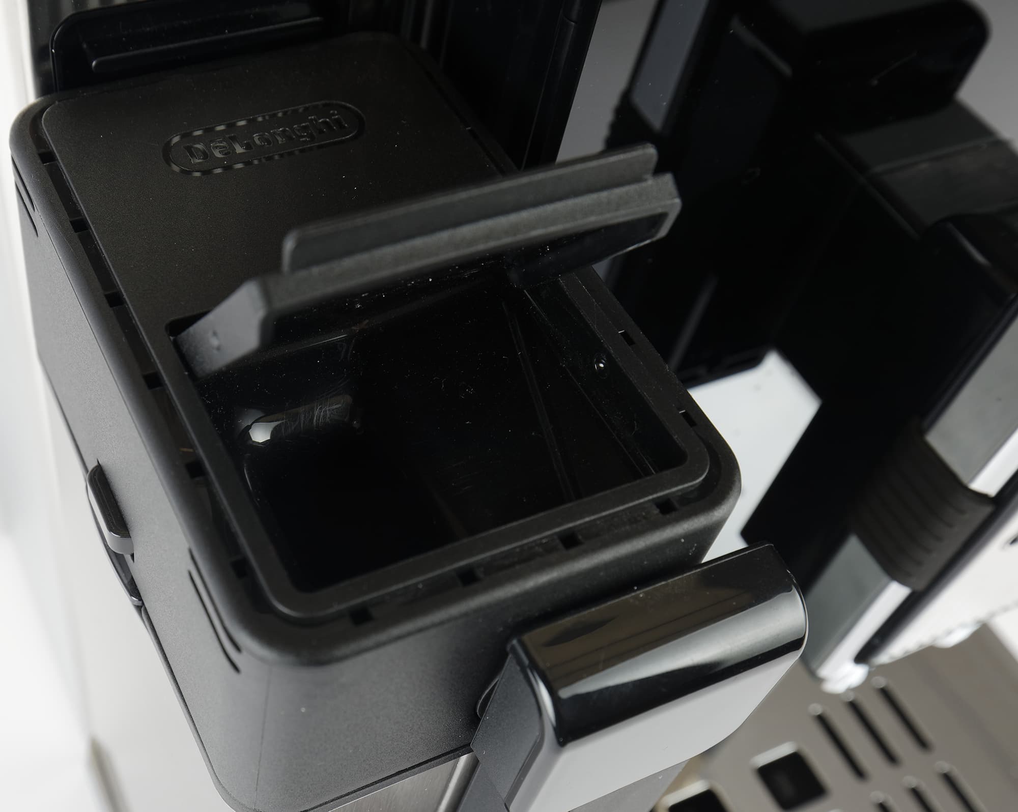 За крышкой мы также видим съемный заварочный блок, вмещающий до 14 граммов молотого кофе. Технически он не сильно отличается от тех, которые мы встречали в кофемашинах De’Longhi ранее. Немного изменилось посадочное гнездо и привод, вследствие чего съемный блок стал более компактным.