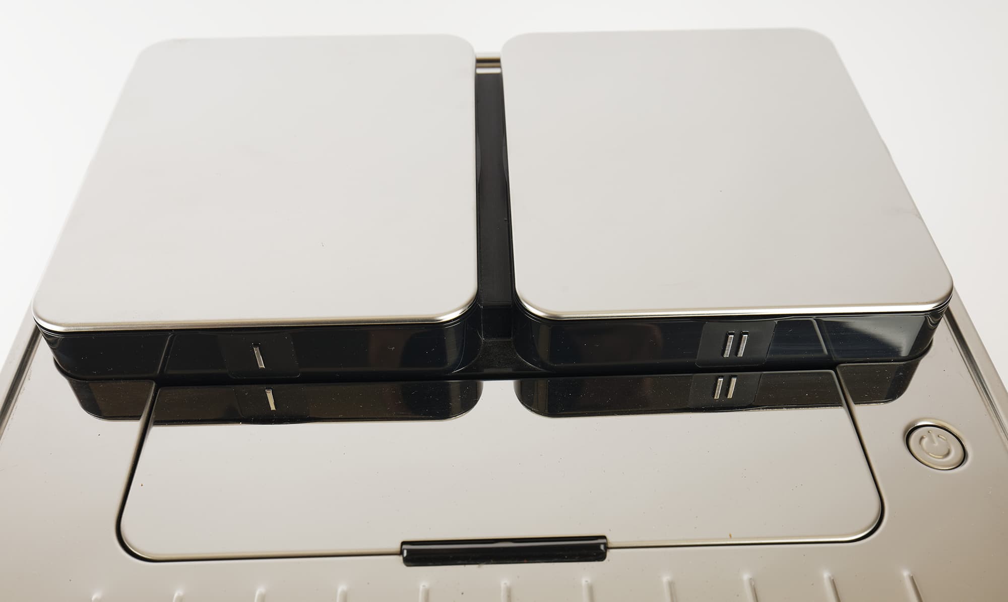 Включение и выключение прибора в повседневном режиме осуществляется с помощью кнопки, расположенной на правой части корпуса, сверху. Сверху же мы видим две крышки, под которыми прячутся две кофемолки, и откидную крышку для молотого кофе (под ней предусмотрено место для хранения ложечки).
