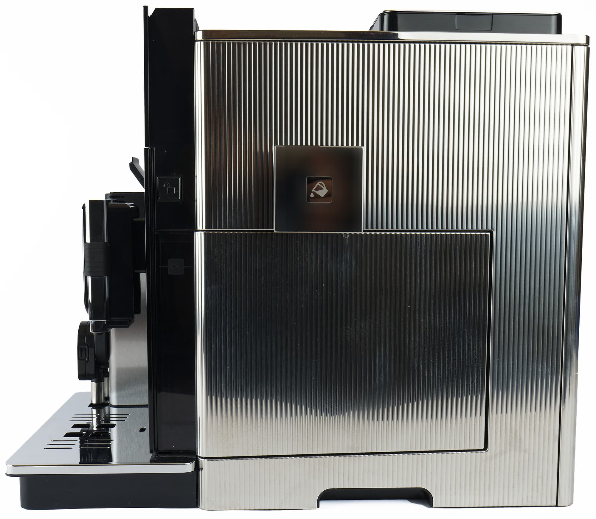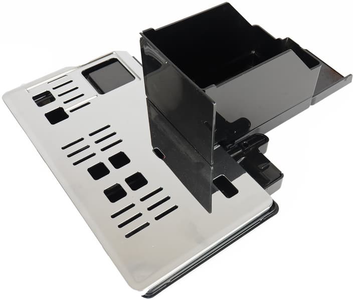 Верхняя панель (место для пассивного подогрева чашек), крышки отсеков для зерен, крышка для молотого кофе — также закрыты металлическими накладками.