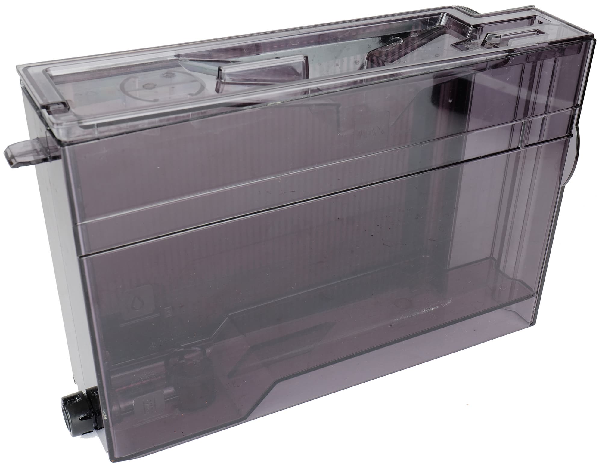 Выдвижной контейнер для воды располагается в правой части. Конструкция стандартна: тут предусмотрено место для установки фильтра, воду можно доливать через отверстие в верхней крышке (а можно ее и снять), по бокам имеются отметки минимального и максимального уровня воды.