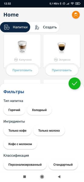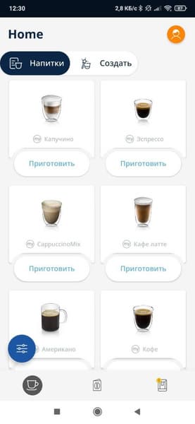 Находясь на главном экране, который появляется автоматически после того, как прибор будет готов к работе, пользователь может одним нажатием запустить приготовление выбранного рецепта (напитка), либо несколькими нажатиями — запустить нужный рецепт с внесением некоторых изменений.