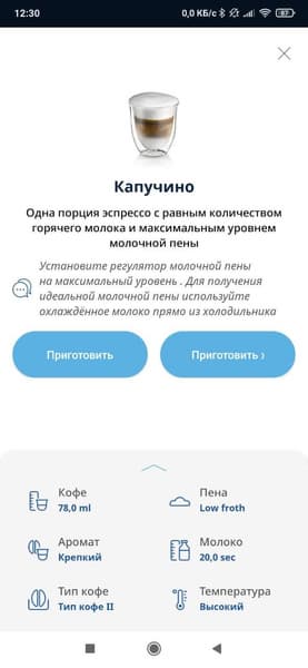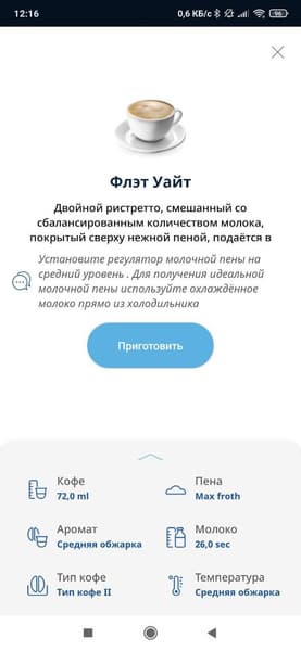 По умолчанию рецепт подразумевает, что машина нальет 78 мл кофе, а потом 20 секунд молока.