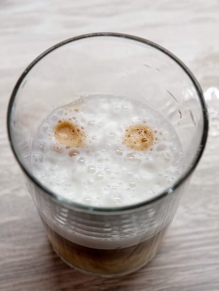 - Холодный кофе — 1 или 2 чашки кофе типа лунго, после чего молочная пена