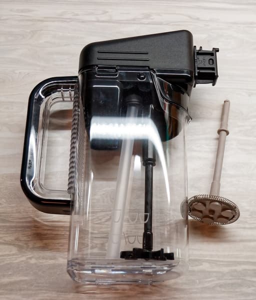 Носик подачи двойной — можно готовить сразу два напитка с молоком. Сам контейнер представляет собой термос (внутренняя часть извлекается), благодаря чему молоко дольше останется холодным (по умолчанию контейнер хранится в холодильнике).