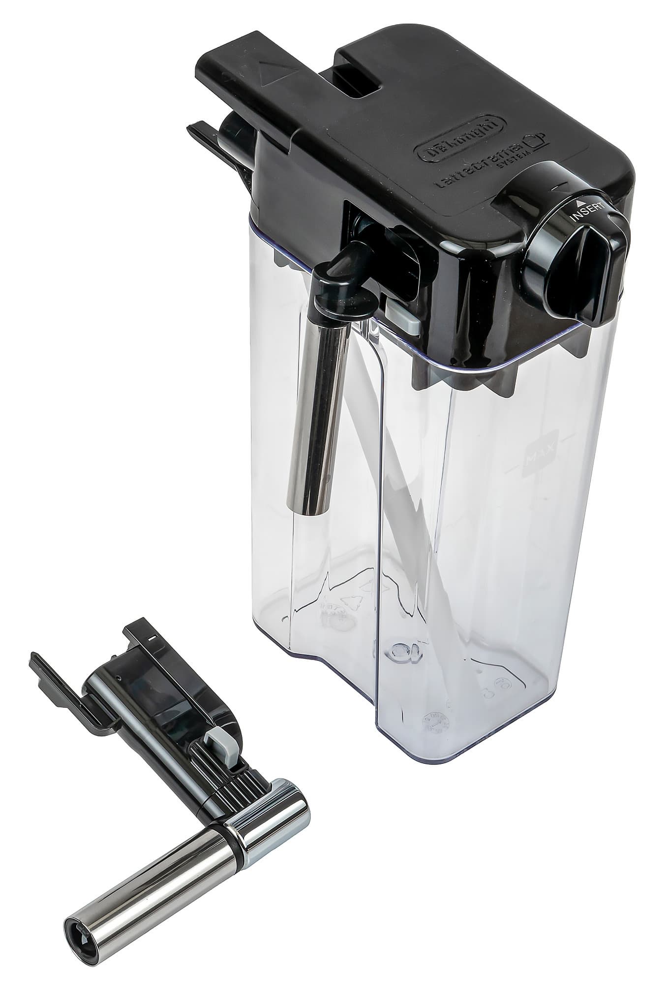 Внизу у него находится контейнер объемом 500 мл с отметкой Max. В этот контейнер наливается молоко, которое автоматически подается через съемную резиновую трубку в крышку (которая, собственно, и является капучинатором). Подвижный носик подачи молока можно направить прямо в чашку.