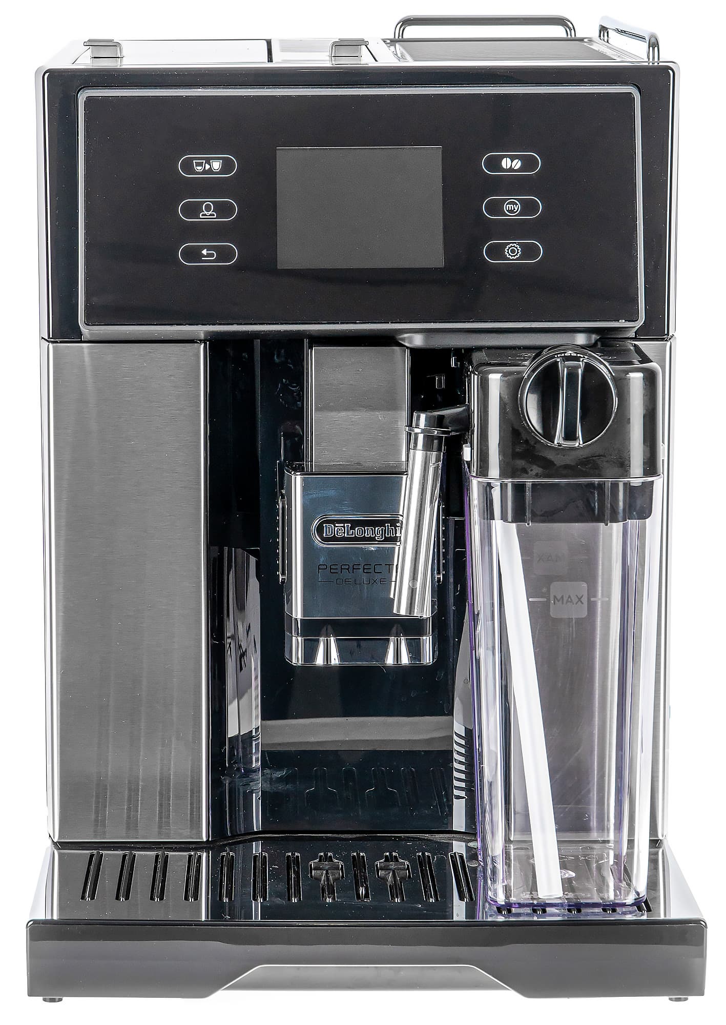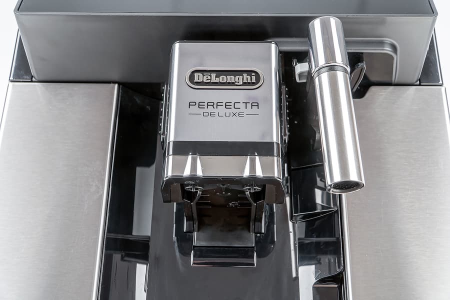 От младших моделей Perfecta (De’Longhi ESAM 420.40 и 420.80 Perfecta Evo) наша Deluxe отличается в первую очередь полноценным управлением с дисплея (без отдельно вынесенных сенсорных кнопок) и повышенным количеством металлических элементов в отделке корпуса.