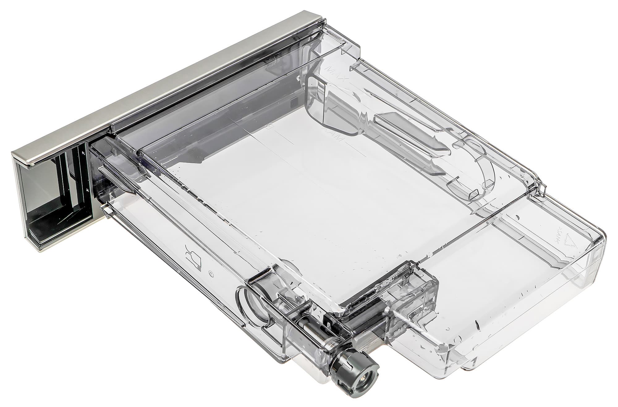 Контейнер для отходов вмещает около 14 порций (то есть, нам придется опустошать его в среднем после приготовления 14 напитков). Достается контейнер спереди, вместе с отсеком для сбора капель. Насколько часто придется выливать воду — зависит от того, какие напитки вы предпочитаете готовить чаще (капучинатор нельзя надолго оставлять без запуска очистки, иначе молоко засохнет, а следовательно каждая очистка капучинатора — это дополнительный расход воды).