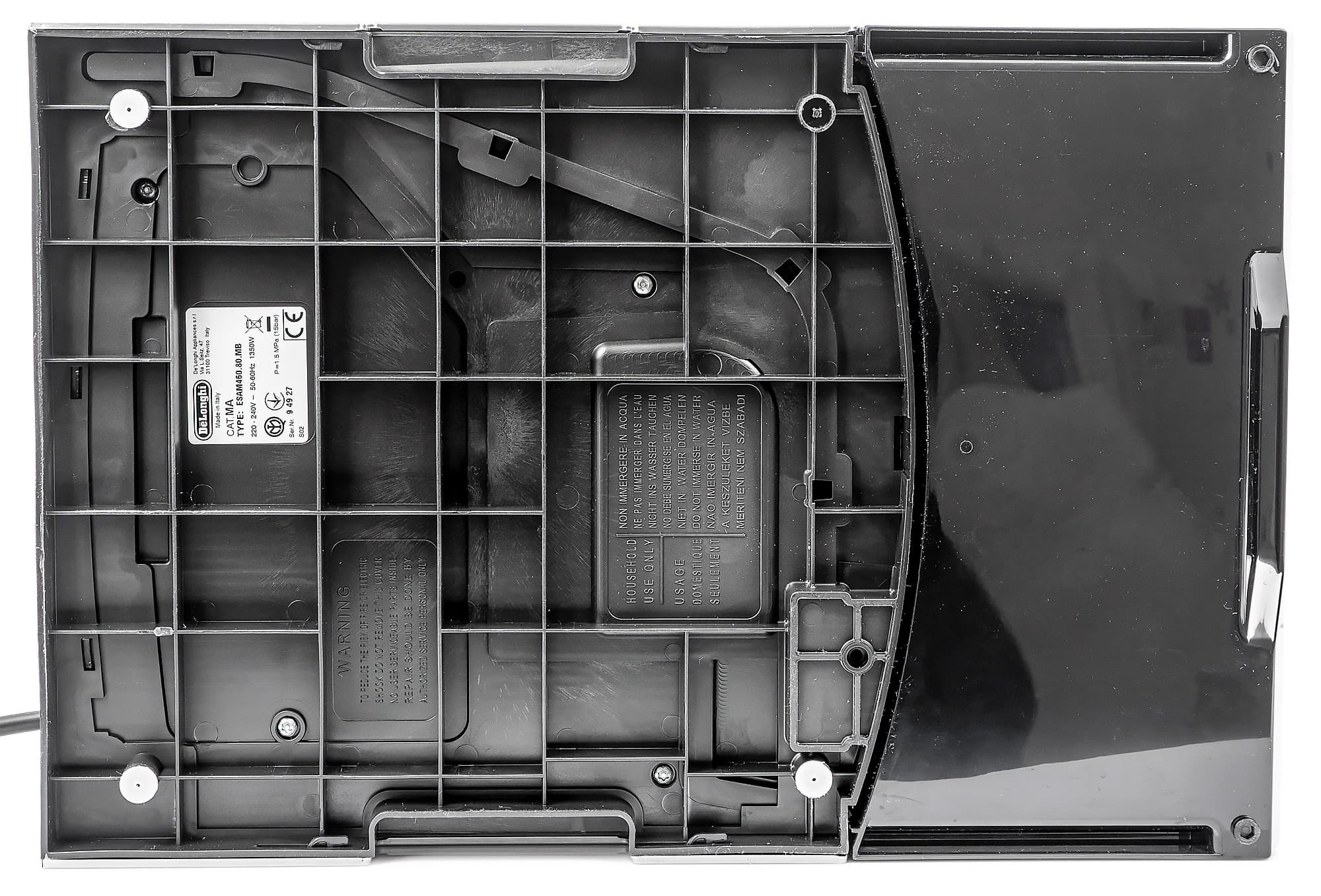 Передняя панель, верхняя панель (место для подогрева чашек), крышка отсека для кофе — металлические.