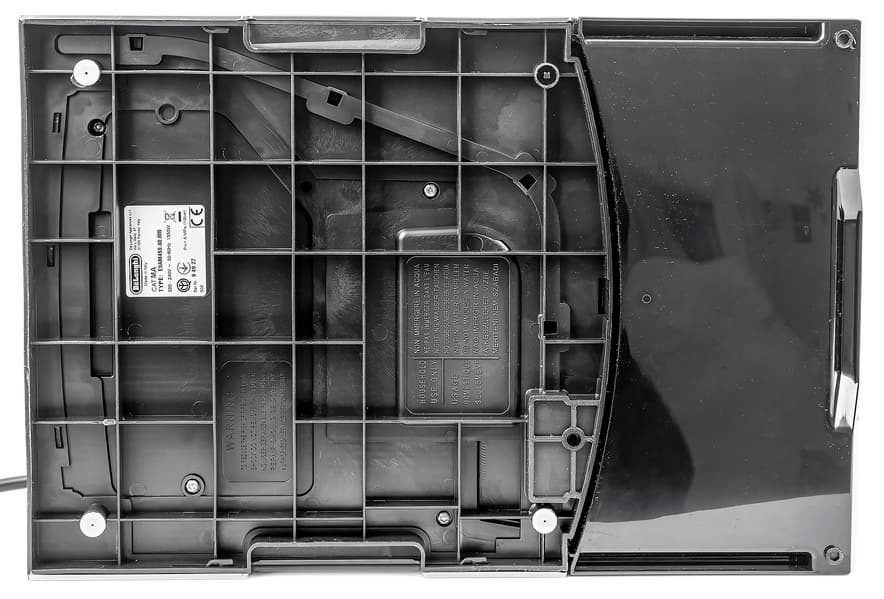 Снизу расположены резиновые антискользящие ножки и наклейка с технической информацией.