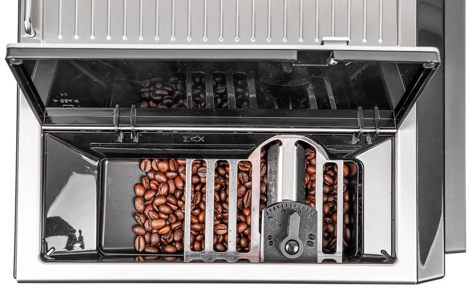 Сверху расположены отсеки для зерен и загрузки молотого кофе, которые закрываются металлической крышкой с плотным уплотнителем. Такое решение не только гасит шум от кофемолки, но также позволяет дольше сохранить свежесть зерна.