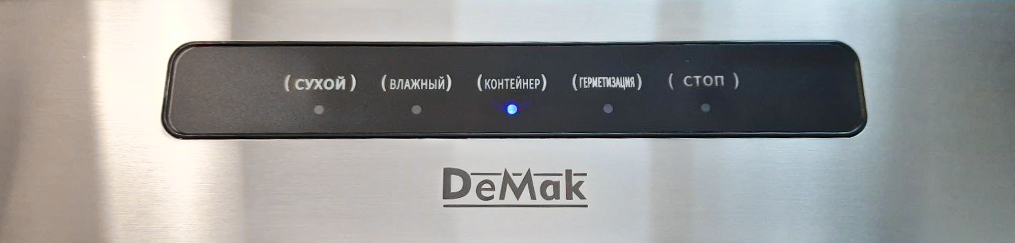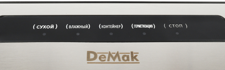 На панели управления 5 кнопок: для вакуумирования сухих продуктов, влажных, для откачивания воздуха из контейнера, для запаивания пакета без откачки воздуха и для остановки процесса.