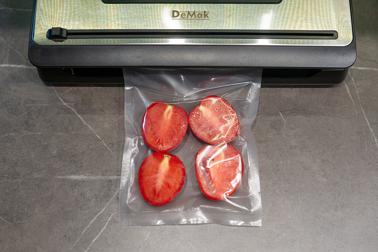Так же и с продуктами, не терпящими излишнего давления — в любой момент прерываем процесс вручную и герметизируем. Правда, в ходе тестирования мы отметили, что вакууматор и так не пережимает нежные продукты, главное аккуратно разложить их в пакете.