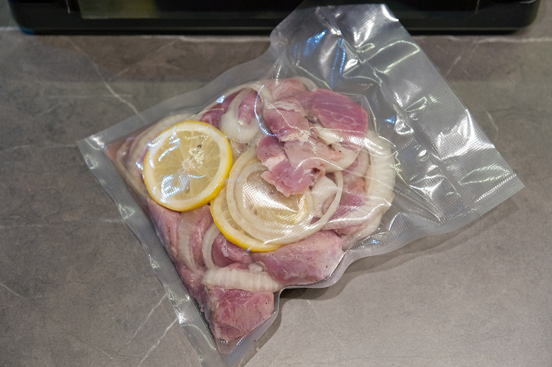 Будущий свиной шашлык предварительно полежал в маринаде примерно 6 часов. Чтобы не испачкать края пакетов, мы вывернули их наружу, затем поместили в пакет мясо, равномерно распределили в нем лук и добавили кружок лимона — всё, в чем мясо мариновалось.