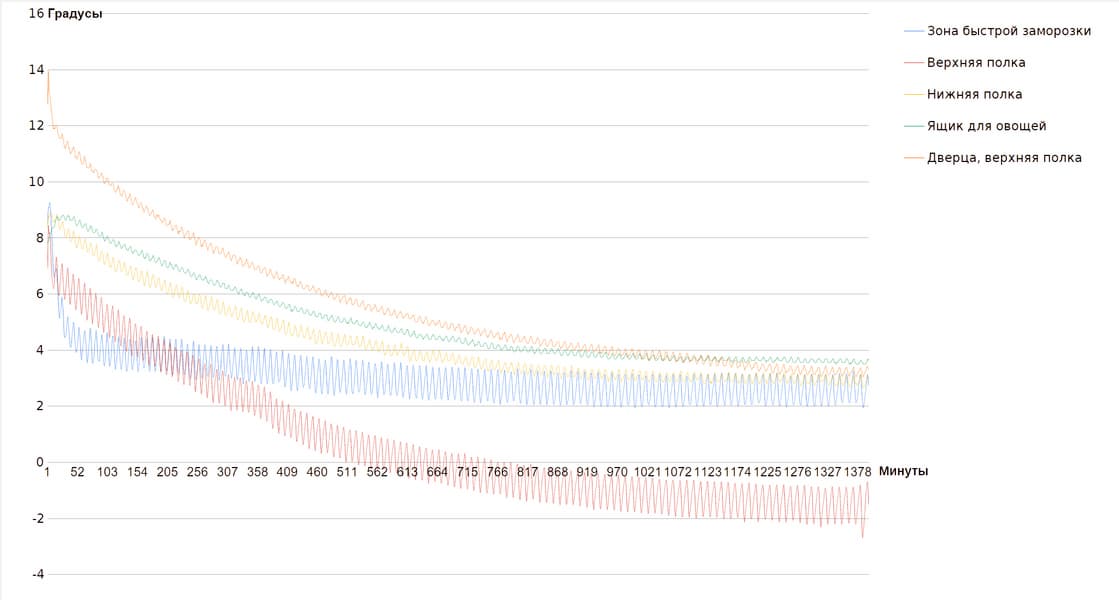 Через сутки работы на максимальной мощности температура всех зон (кроме верхней полки) пришла к одному уровню — 2-4 °C. Датчик на верхней полке показал в среднем −1 °C.