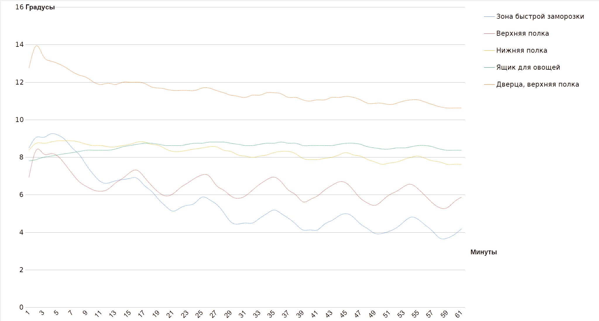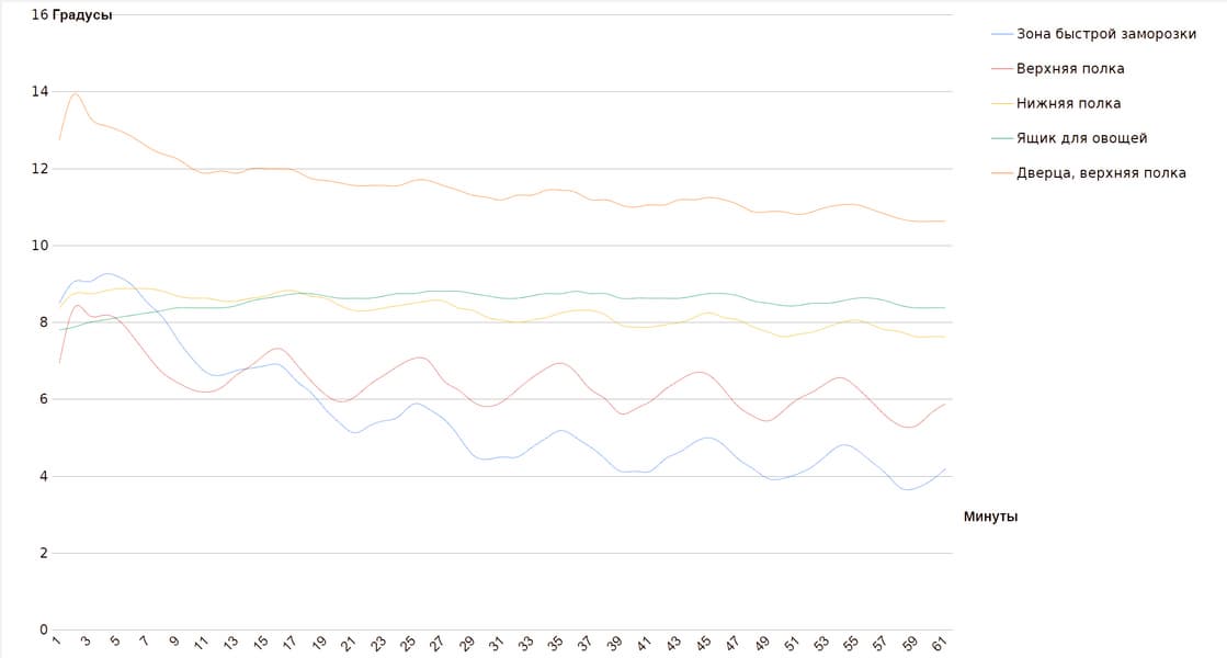 На графике можно видеть, что в зоне быстрого охлаждения и на верхней полке температура колеблется в относительно широких пределах, понижаясь при включении компрессора и повышаясь после его отключения. На нижней полке, в ящике для овощей и на дверце перепады температуры можно признать несущественными.
