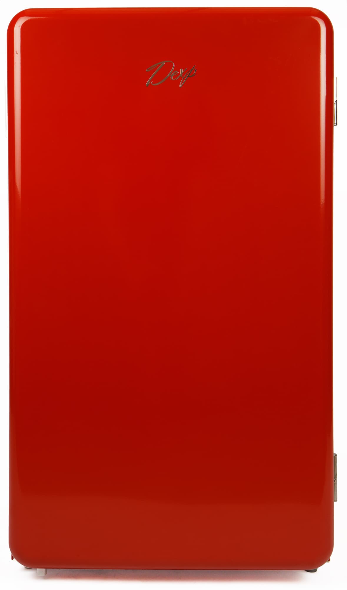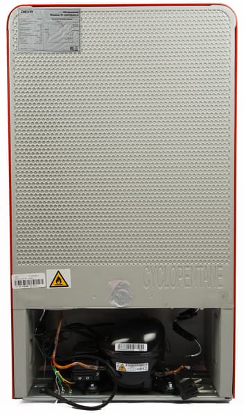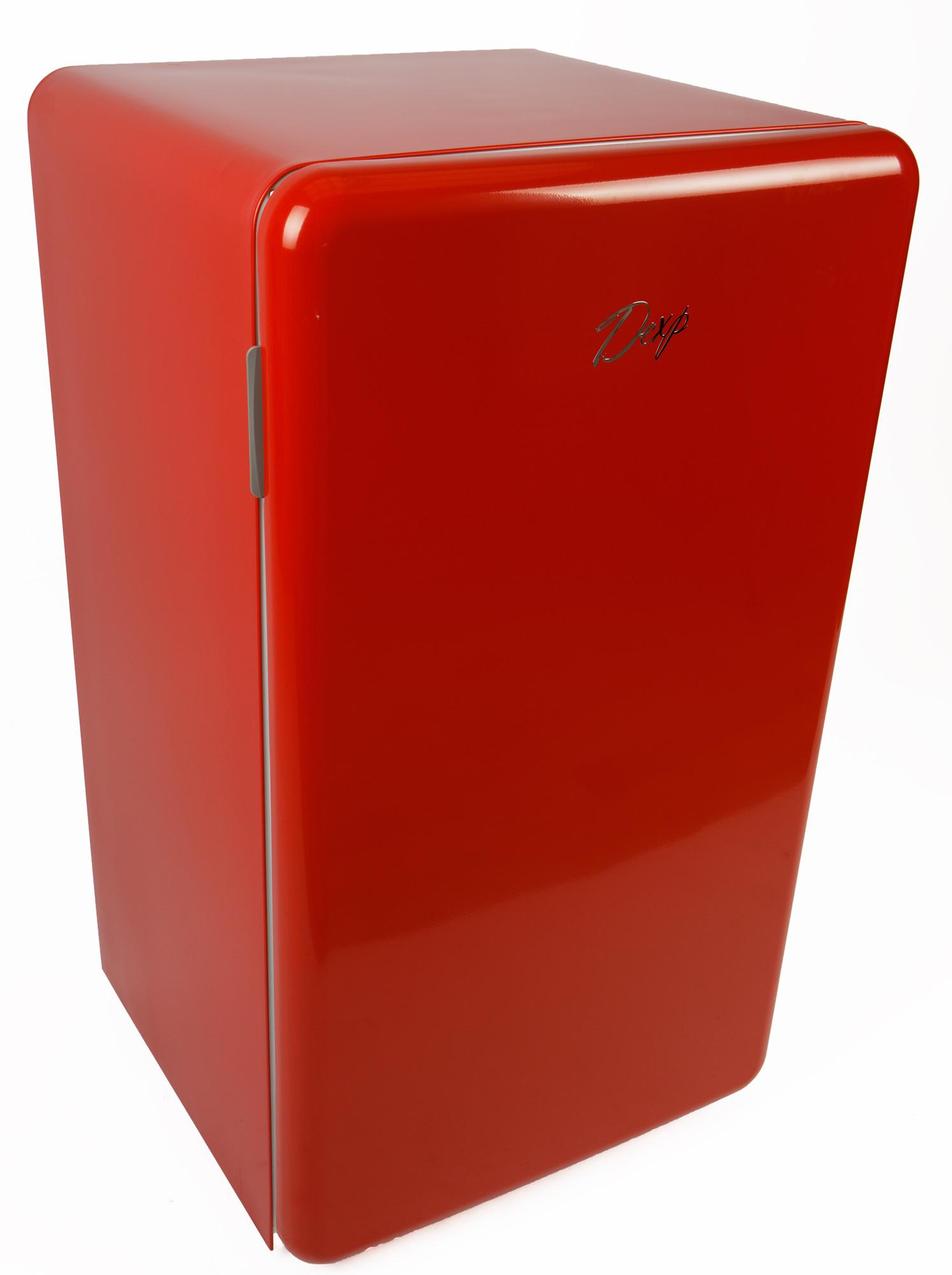 Корпус прибор окрашен красной глянцевой эмалью (также доступны черный и белый варианты). Дверца открывается вправо и перевесить ее нельзя. По центру дверцы сверху размещен логотип Dexp.