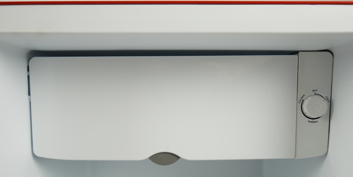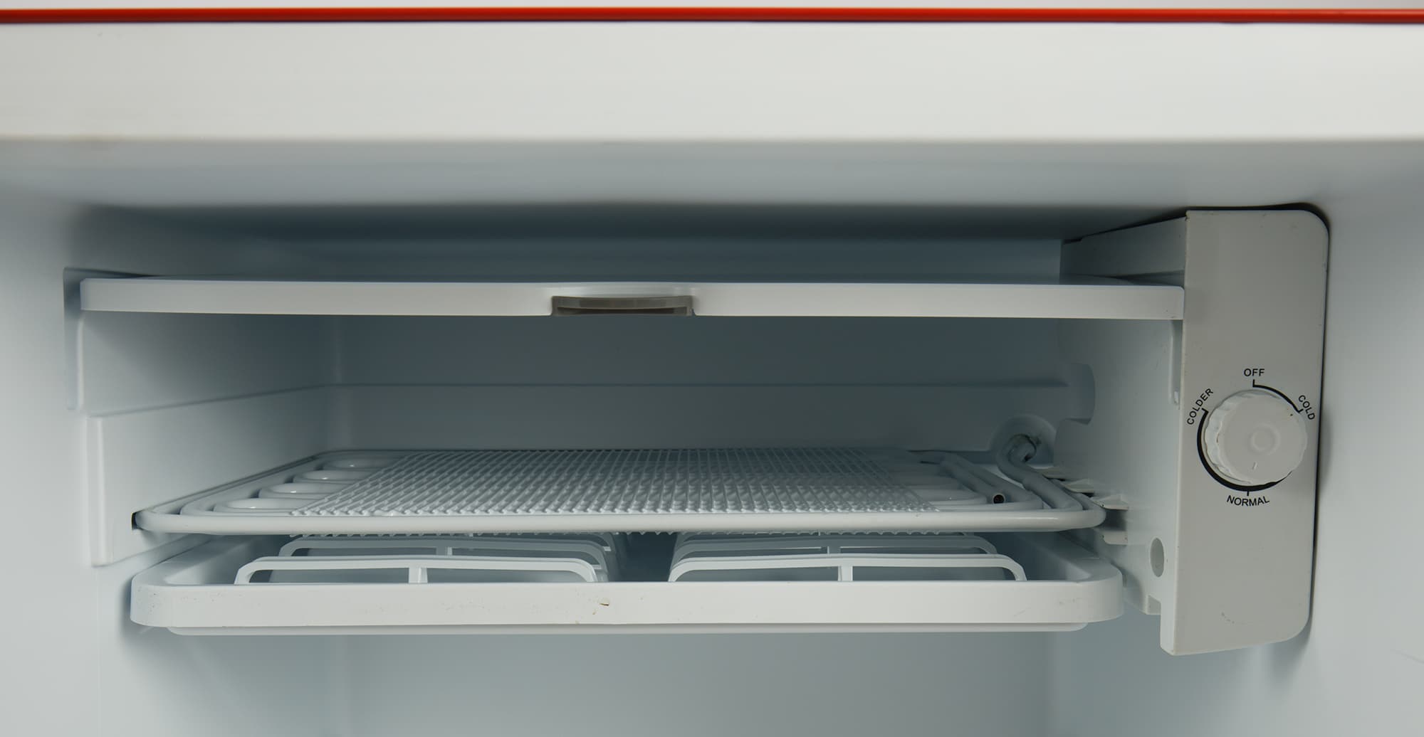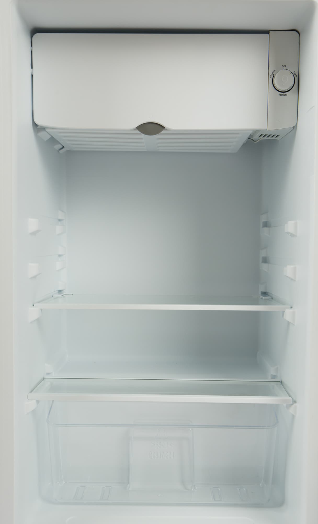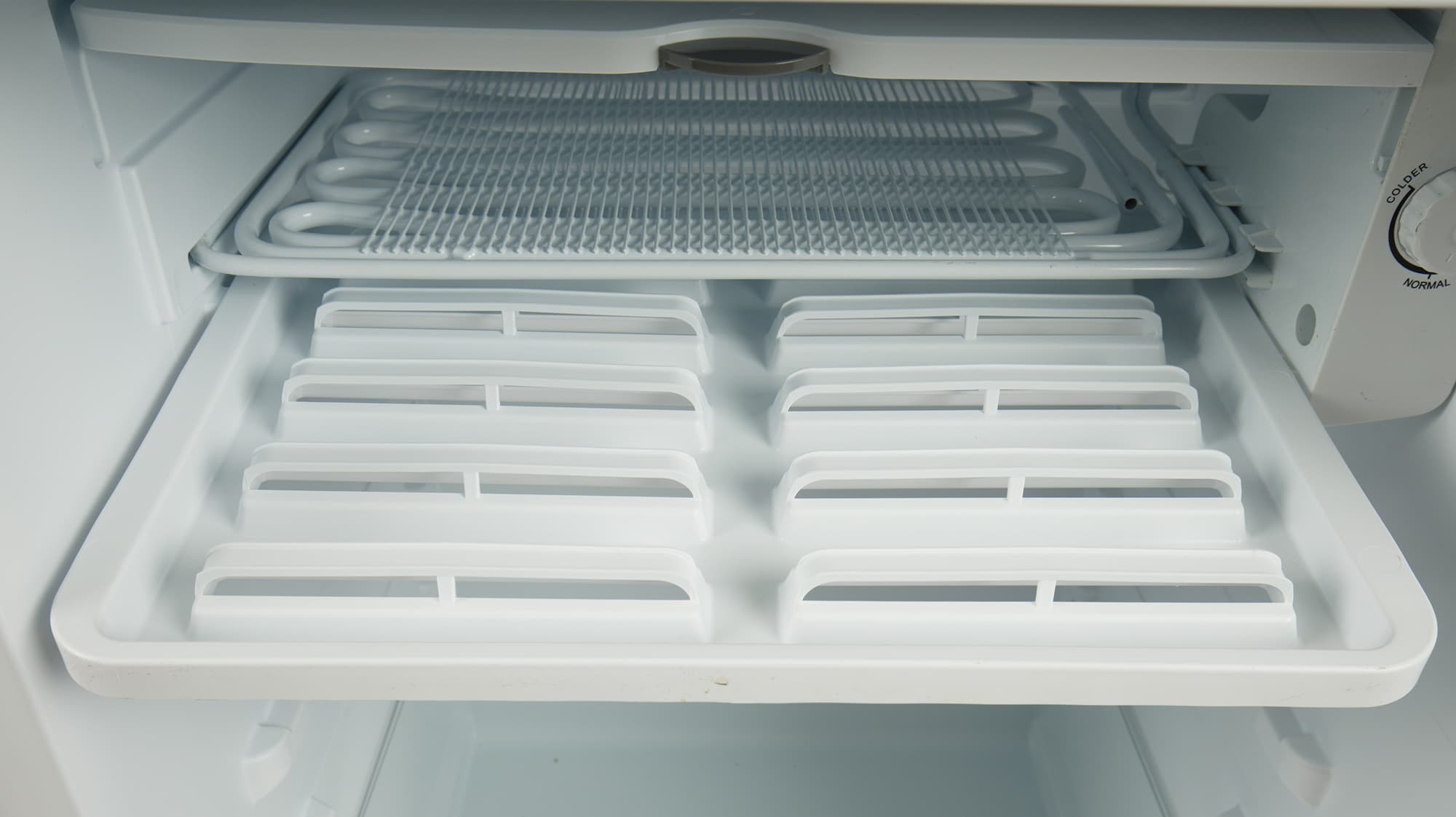 В нижней части камеры быстрого охлаждения находится металлическая конструкция, распределяющая холод равномерно, по всей площади камеры. Справа — регулятор мощности прибора (единственный орган управления холодильником).