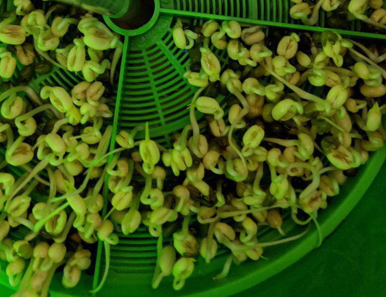 Второй подход к снаряду был на летнем режиме — 120 часов, пять суток. На этот раз поставили два лотка и взяли четыре вида семян: кроме пшеницы и маша — еще овес и зеленую гречу из самого простого районного магазина здорового питания.