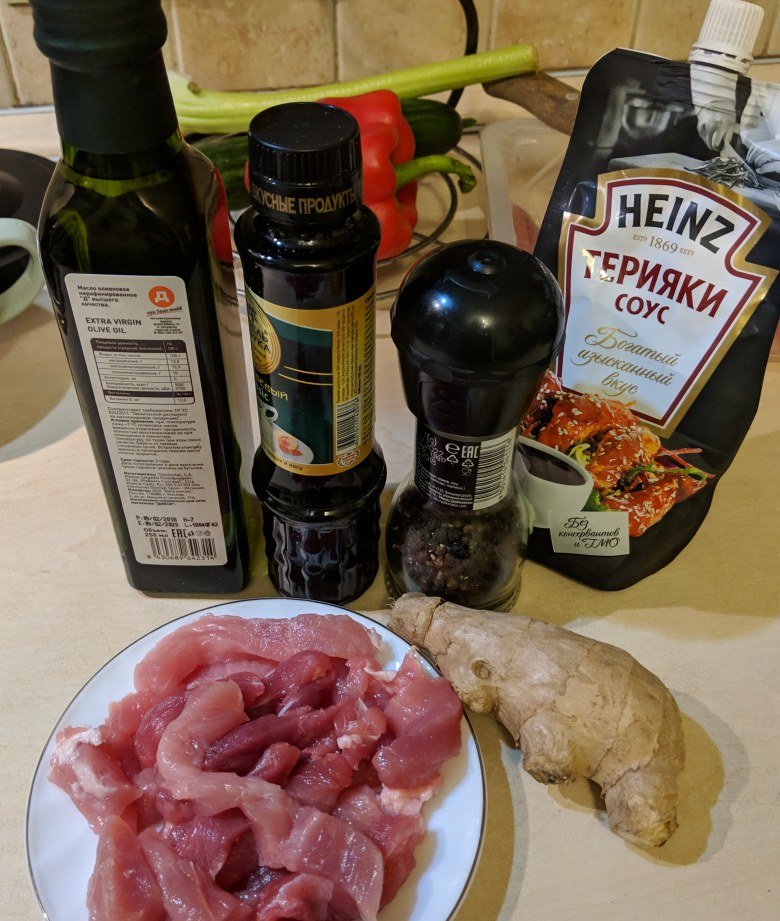 За основу взяли рецепт свинины с пророщенной соей и овощами. По рецепту положены грибы шиитаке и лук-порей, но их не было под рукой — решили импровизировать.