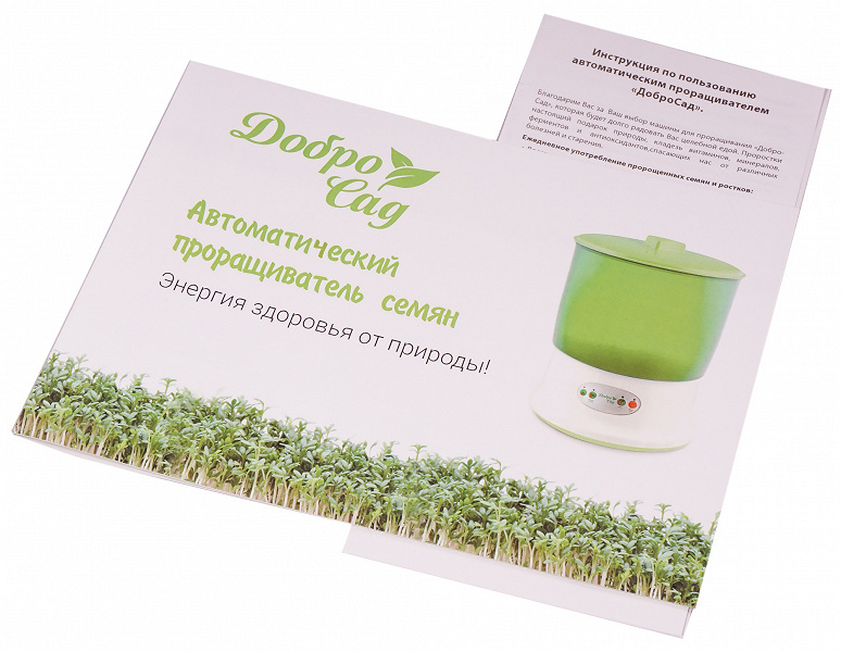 В коробке лежали два документа. Цветной буклет описывает, в основном, пользу от пророщенных зерен и аудиторию, которой будет интересен этот прибор. Из безусловно полезного в нем нашлись характеристики устройства: упоминаются три вида температурных режимов, круговое разбрызгивание воды, наличие автоматического термостата, объем чаши для проращивания, материал корпуса и наличие светонепроницаемого чехла. Там же указаны все модели «Добросада».