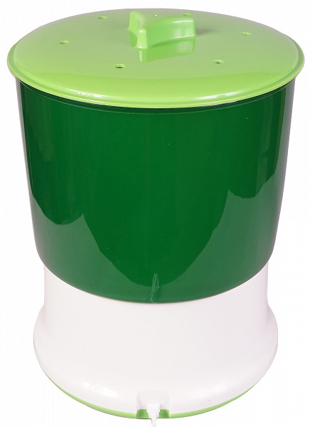 Вторая крупная деталь проращивателя — собственно чаша для проращивания, имеющая форму ведра с отверстиями на дне и объемом 8,5 л. Сделана она из довольно гибкого и тонкого цветного пластика. Прочнее ей быть ни к чему, нагрузок на нее нет никаких, но вне эксплуатации с ней надо быть бережнее.
