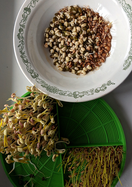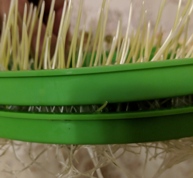 И пшеница, и (предположительно) маш выросли миллиметров до 6-7, непророщенных зерен осталось исчезающе мало. Корешки угрожающе щетинятся снизу — что-то возникают сомнения насчет двух лотков одновременно.