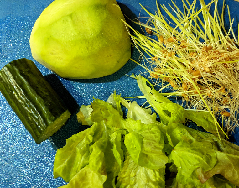 Получившийся результат решили так не есть, а обработать кулинарно. Ростки — сами по себе продукт довольно экзотический для нашего стола, поэтому тут есть два пути: доводить экзотику до предела или постараться снизить ее градус и приготовить продукт с тем, что есть в ближайшем магазине, причем затратить на это как можно меньше сил. Стоит ли говорить, что мы пошли по второму пути?