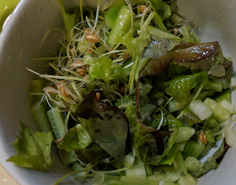 Вкус специфический, слегка сладковатый. Дозаправка перцем и соевым соусом помогла сделать из специфического экзотический. Салат выглядит как очень полезная еда и по сути таковой является. Несмотря на кажущуюся легкость, проростки пшеницы довольно питательные, если съесть среднюю тарелку — наедаешься. О какой-то дополнительной легкости или немедленной пользе речи не идет: все растительные средства оздоровления тем и отличаются, что их надо применять регулярно в течение достаточно долгого времени.