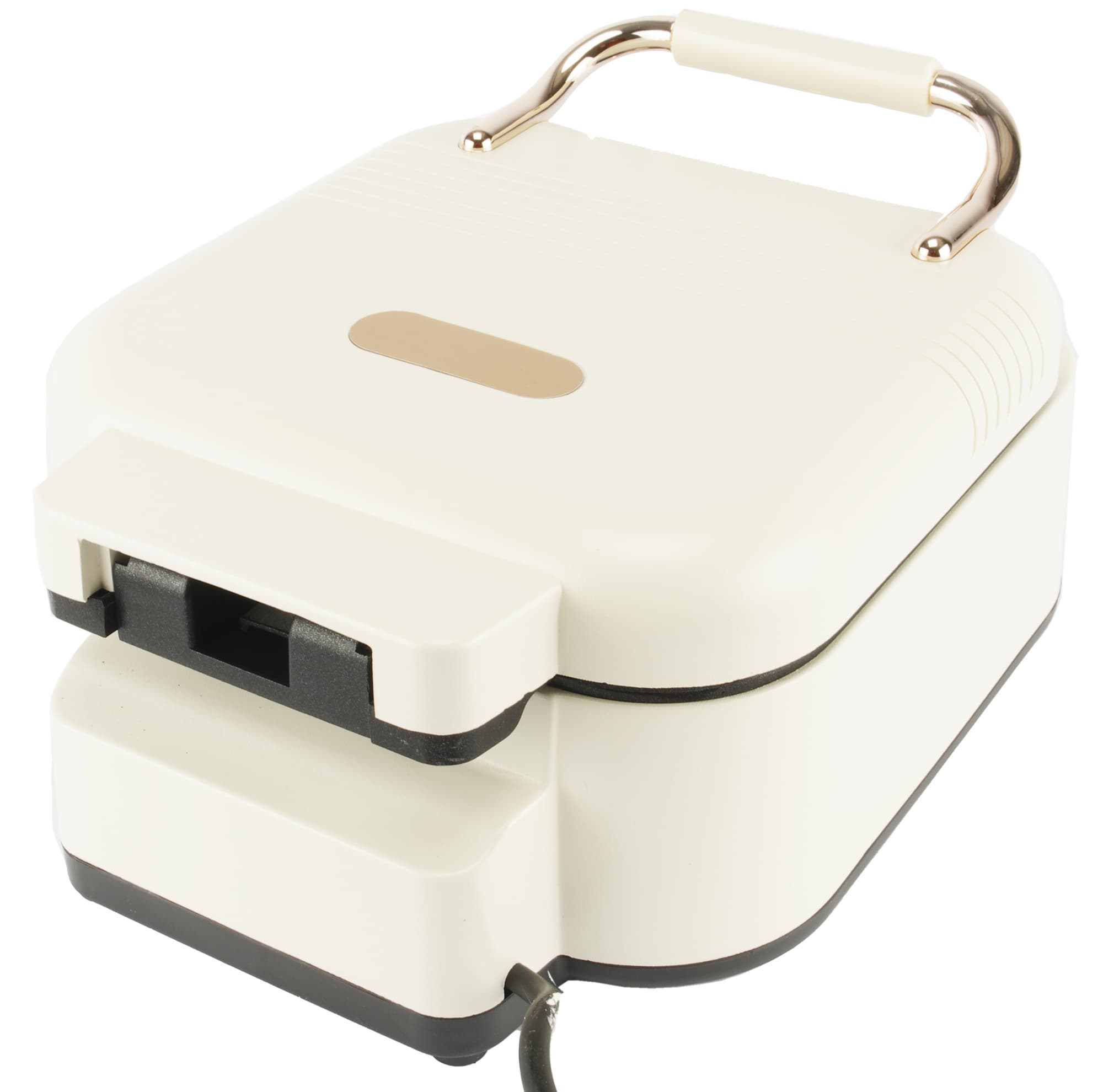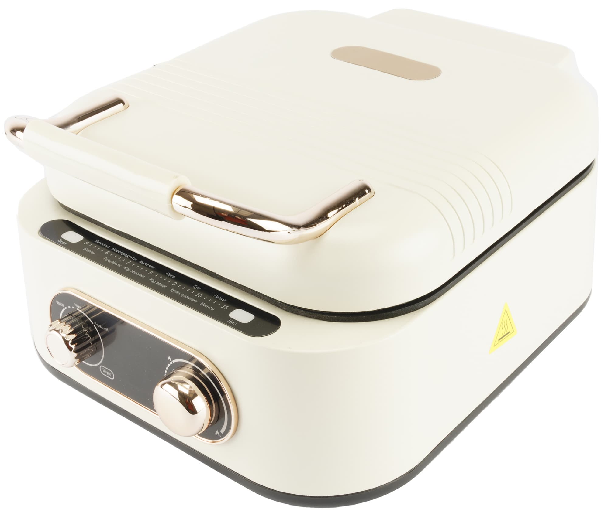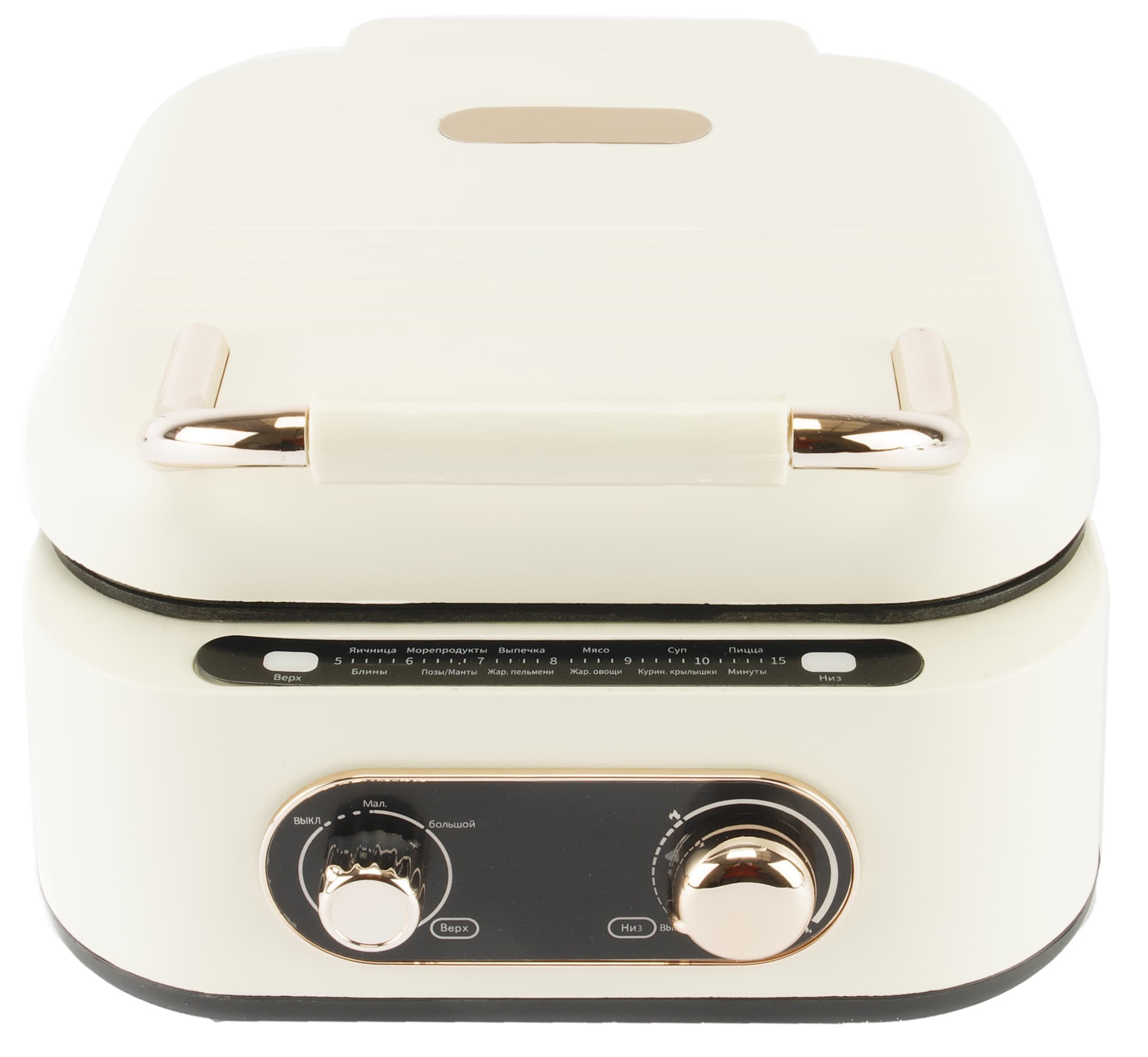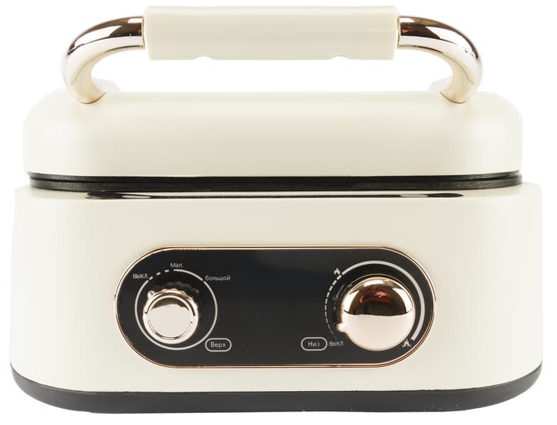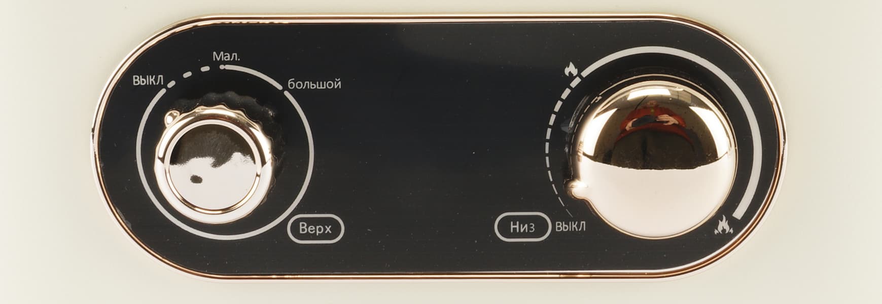Небольшие симпатичные поворотные переключатели бронзового цвета перекликаются с ручкой, окрашенной в такой же цвет. А все надписи с подсказками по времени или выбором температурного режима расположены на черных вставках. И, пожалуй, только эти темные пластиковые акценты и добавляют прибору серьезности.