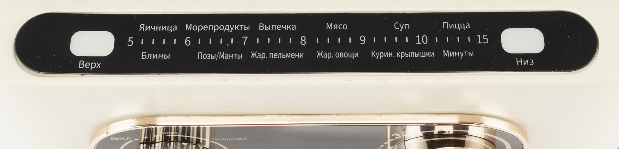 Для удобства пользователя над панелью управления находится подсказка с указанием времени в минутах для приготовления желаемых блюд. Но какие при этом должны быть выставлены настройки на переключателях — неизвестно.