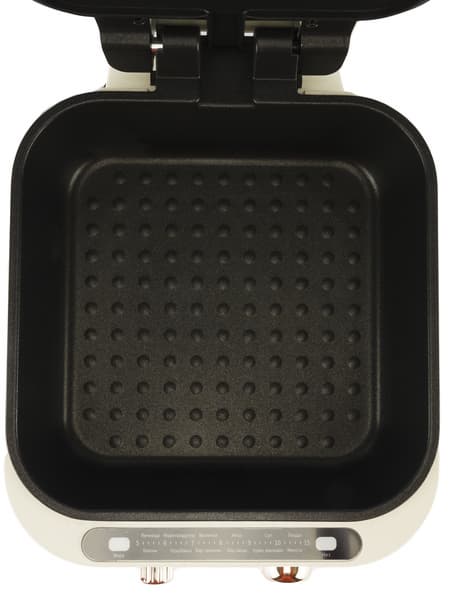 Под панелью гриля с антипригарным покрытием находится достаточно мощный тэн. По заявлениям производителя, максимальная мощность прибора составляет 1800 Вт.