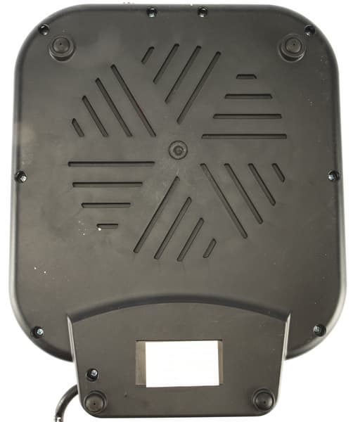 На дне устройства мы наблюдаем множество углубленных вентиляционных отверстий в виде линий разного размера, изнутри защищенных от влаги и пыли дополнительным пластиковым экраном, также у прибора имеются четыре прорезиненных ножки. В задней части расположен глянцевый серебряный шильдик с краткой технической информацией о приборе (к сожалению, на фото он отразил свет).