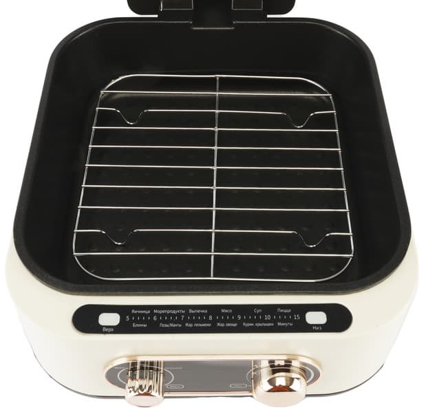 Также в кастрюлю может быть установлена небольшая металлическая решетка на ножках. Ее можно использовать для приготовления продуктов на пару, либо чтобы приподнять ингредиенты поближе к верхнему тэну.