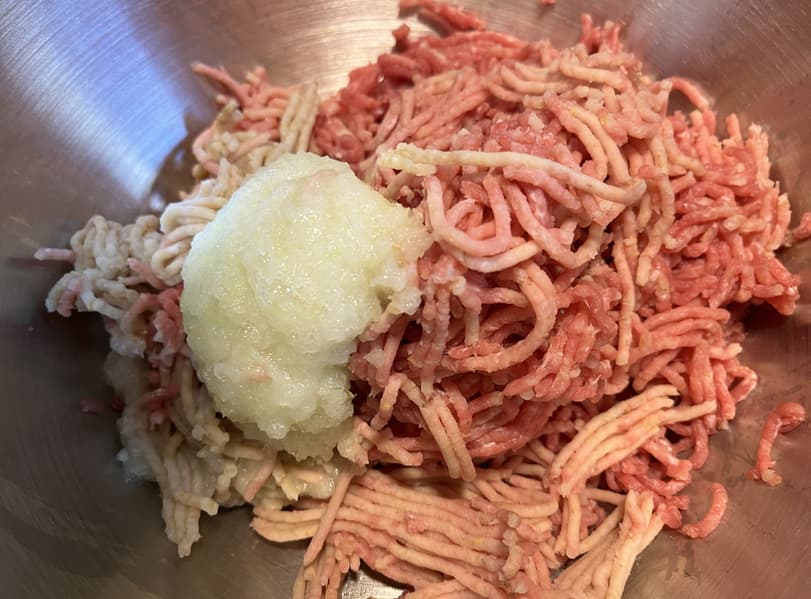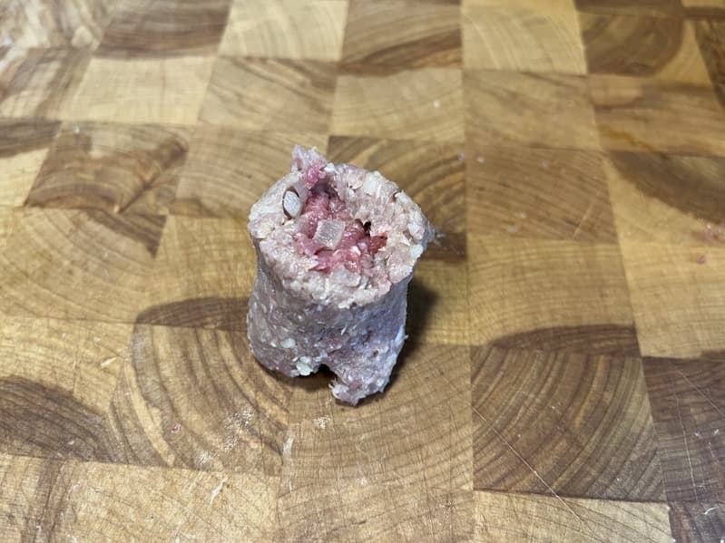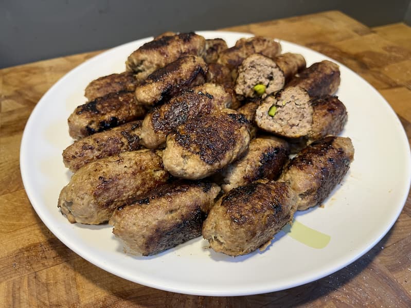Для этого блюда мы приготовили две чаши фарша. Первый — говядина, булгур, лук; второй — говядина, лук, фисташки.