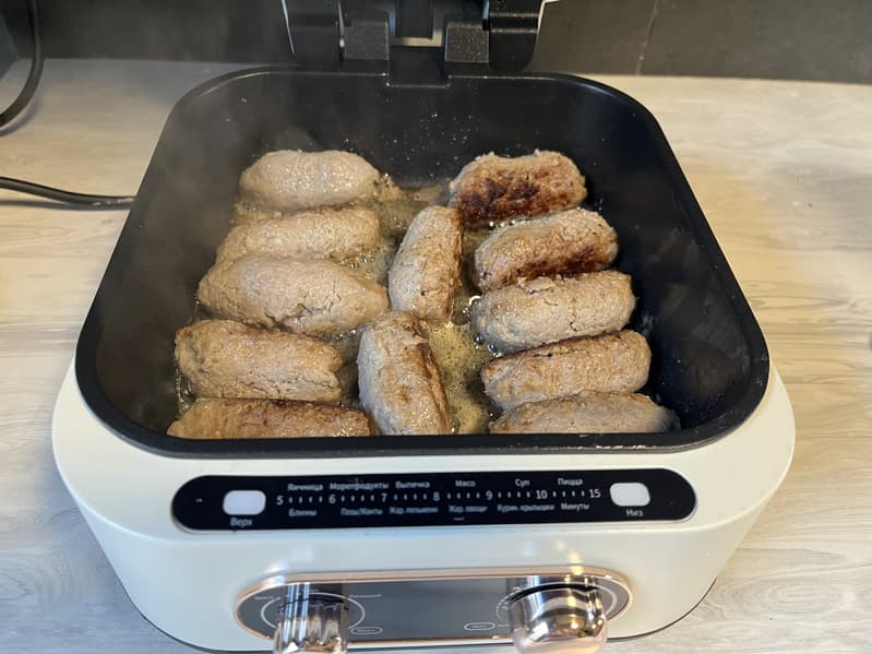 Мы переворачивали котлетки на каждую из четырех сторон, чтобы они стали хрустящими по всей поверхности. Когда все они обжарились, мы поменяли режимы работы кастрюли и гриля на минимальные, сложили все котлетки внутрь кастрюли и протушили их еще в течение 10 минут.