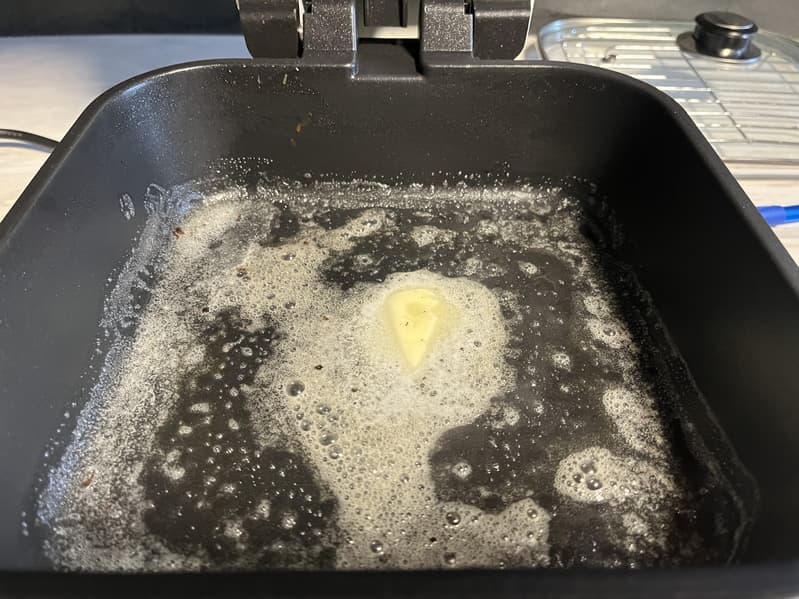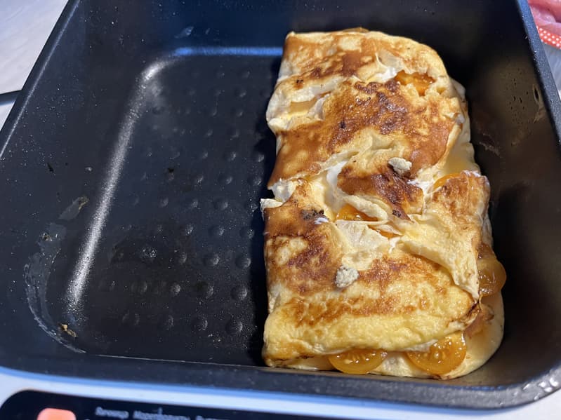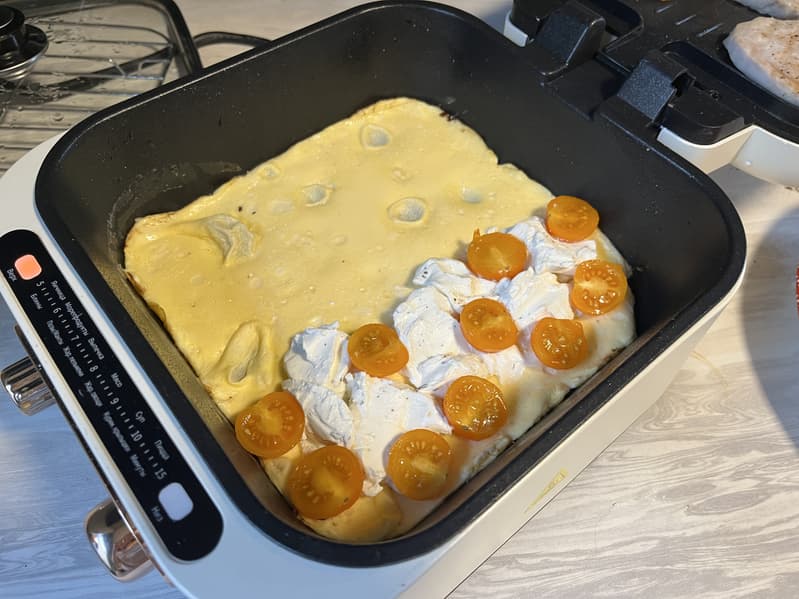 Этой температуры для омлета оказалось многовато, он начал надуваться, а на поверхности появилось много крупных пузырей. Мы сразу же поменяли режим на меньший и накрыли омлет крышкой.